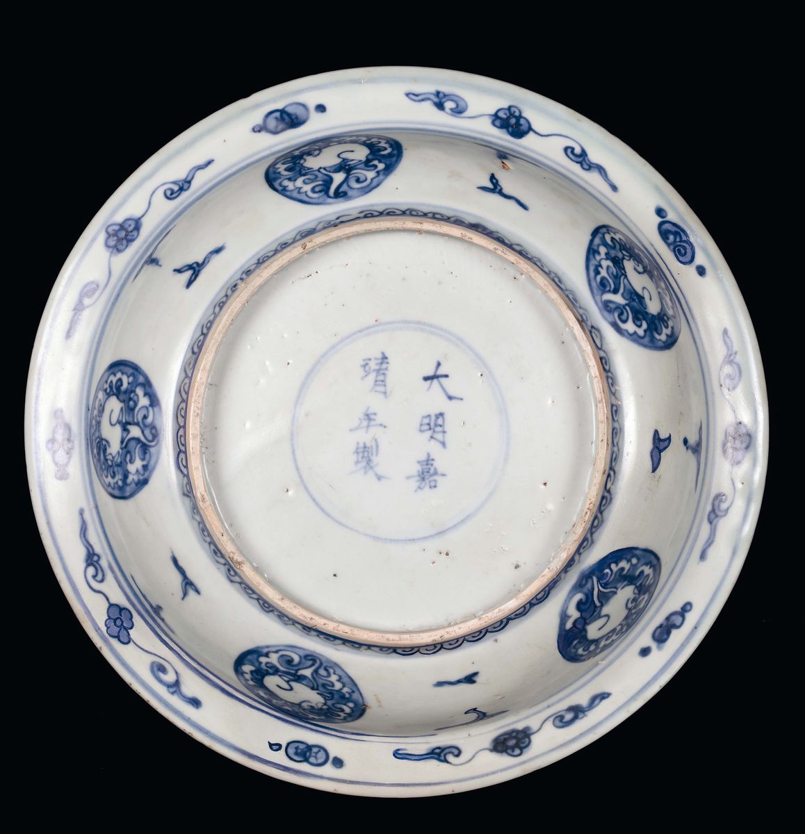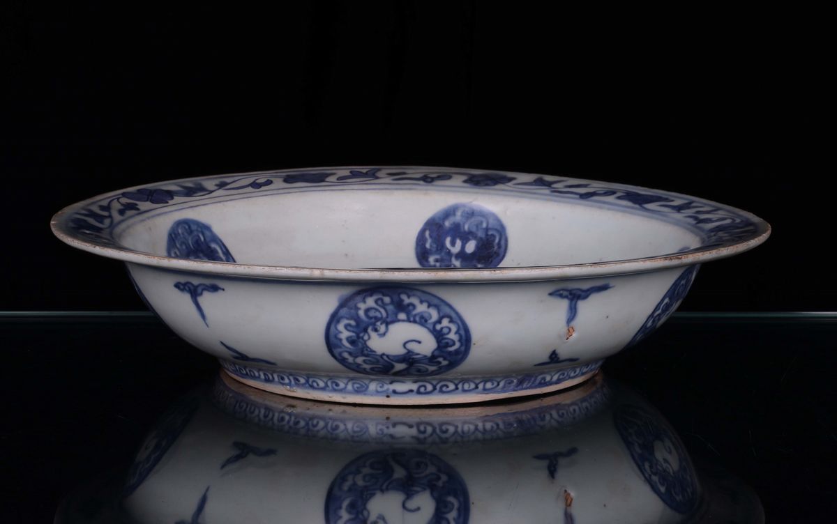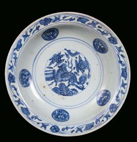 Piatto in porcellana decorato in monocromia turchina con animale fantastico al centro del cavetto, Cina, Dinastia Ming, [..]