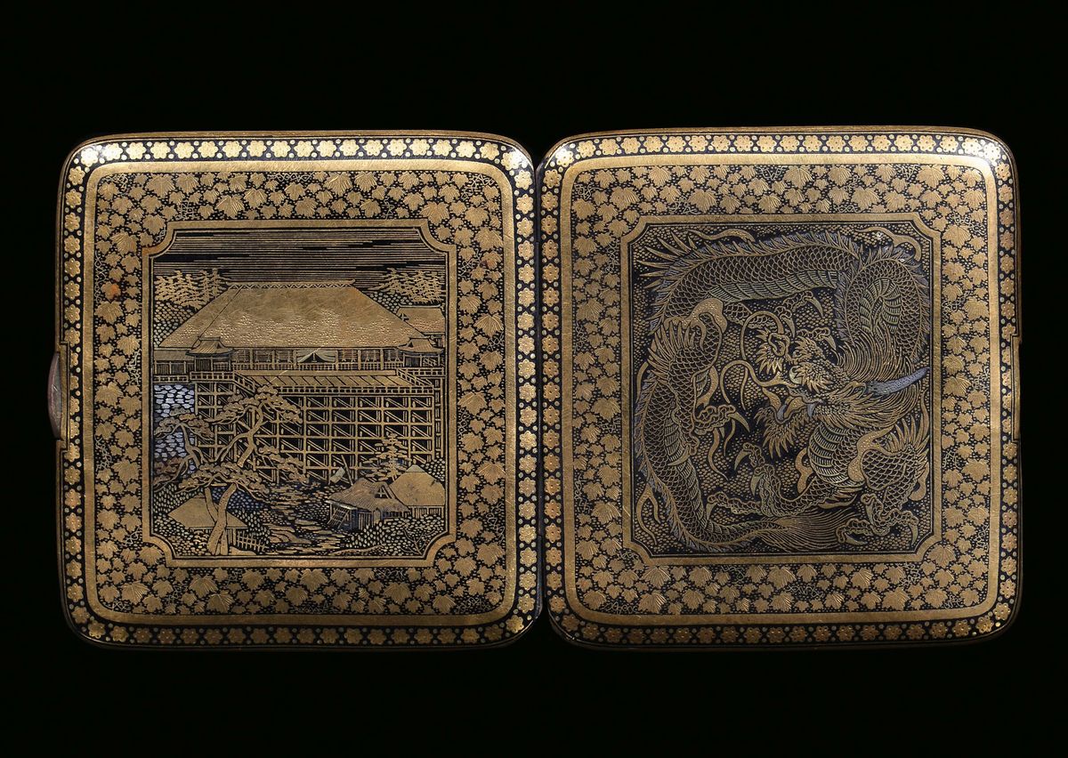 Porta sigarette niellato in oro 9 kt con interno laccato con paesaggio e dragone, Giappone, Periodo Meji (1868-1912)
