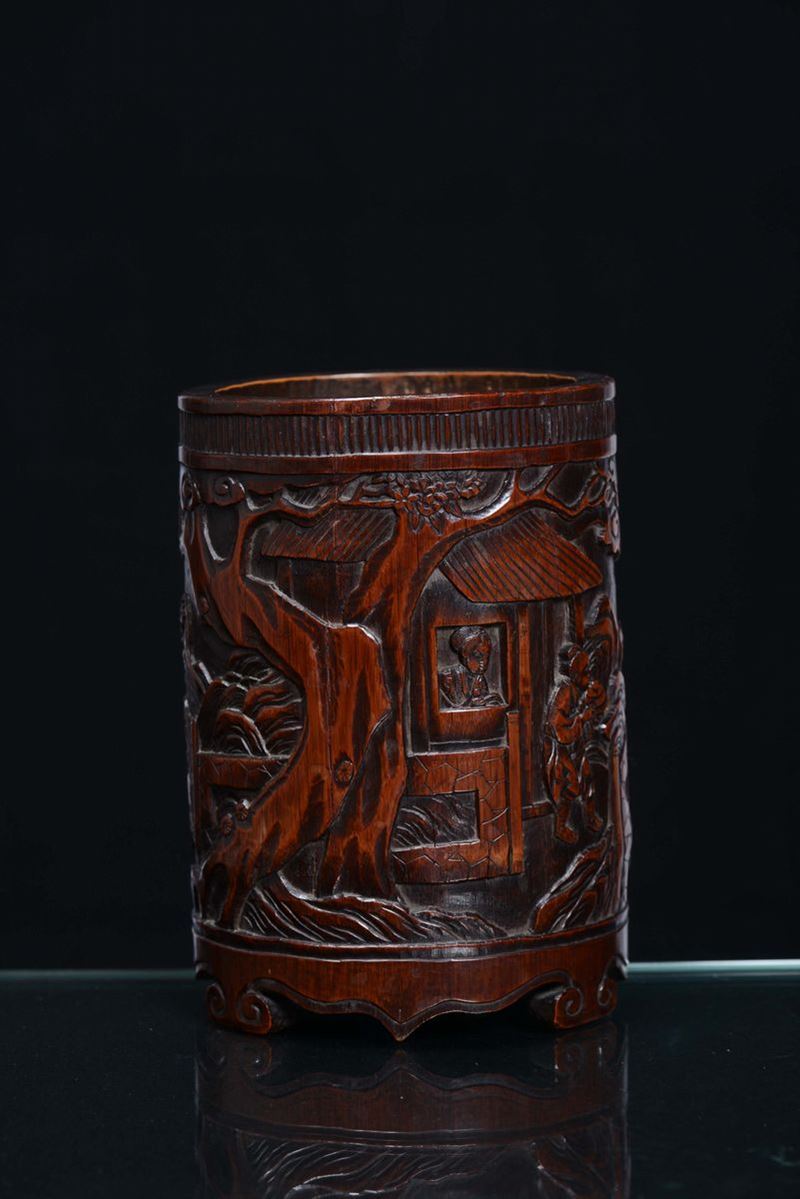 Portapennelli in legno di bambù finemente intagliato con figure orientali, Cina, Dinastia Qing, XIX Secolo