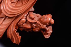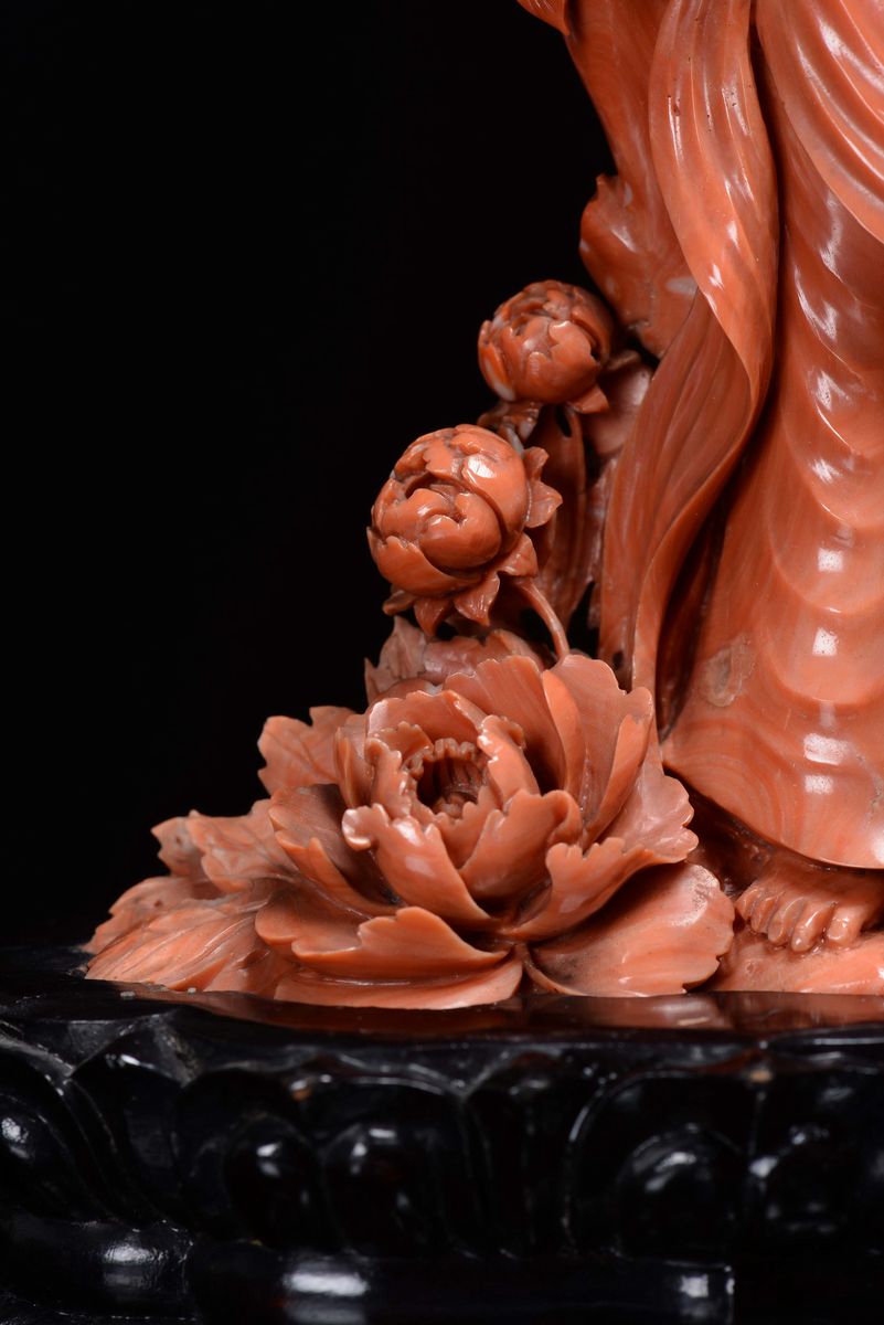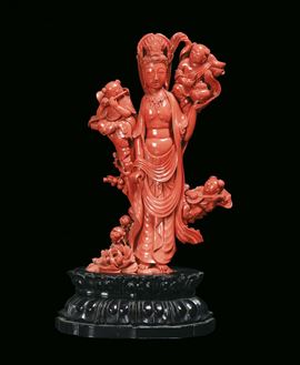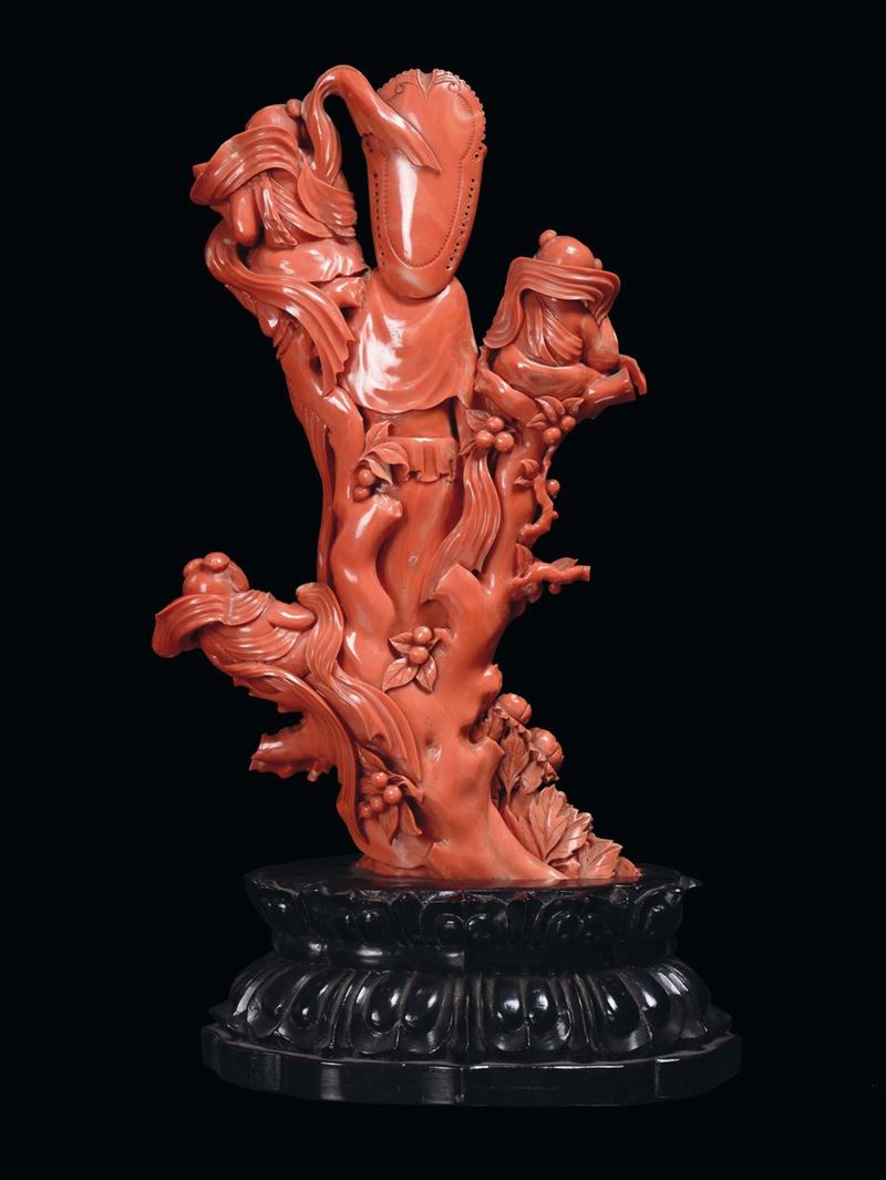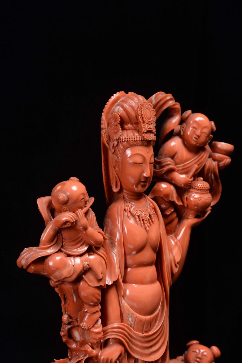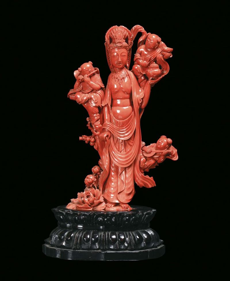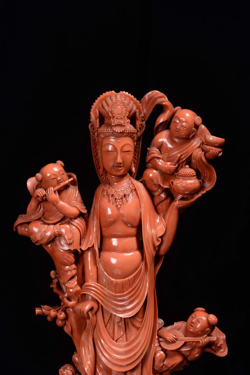 Raro gruppo in corallo rosso raffigurante Guanyin con suonatori finemente scolpito, Cina, Dinastia Qing, inizio XX secolo [..]