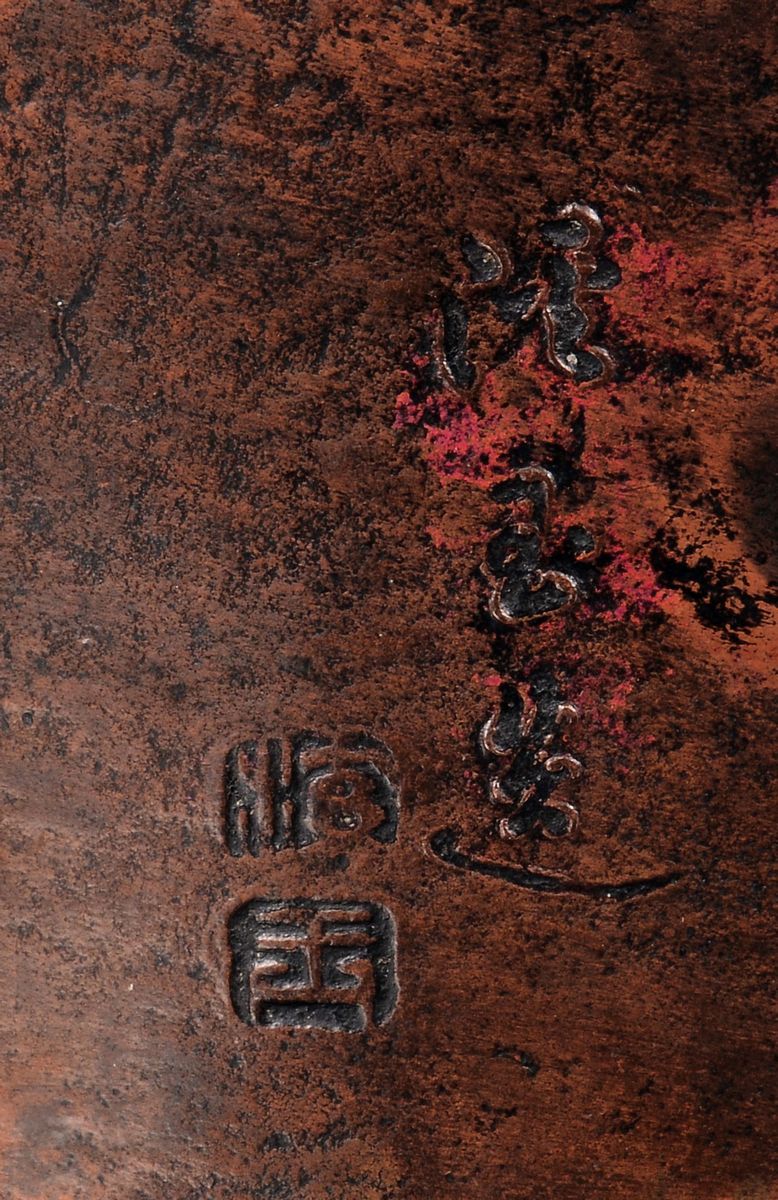 Raro portapennello cilindrico in bronzo con decoro a paesaggio, iscrizioni sul retro, Cina, Dinastia Qing, Periodo Kangxi [..]