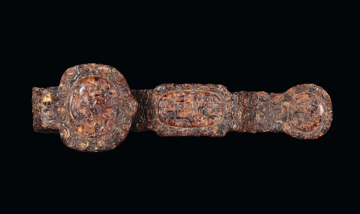 Ruji in ambra finemente intagliata, Cina, Dinastia Qing, XIX secolo