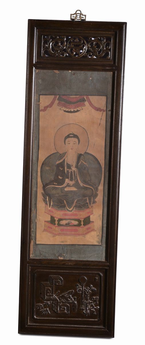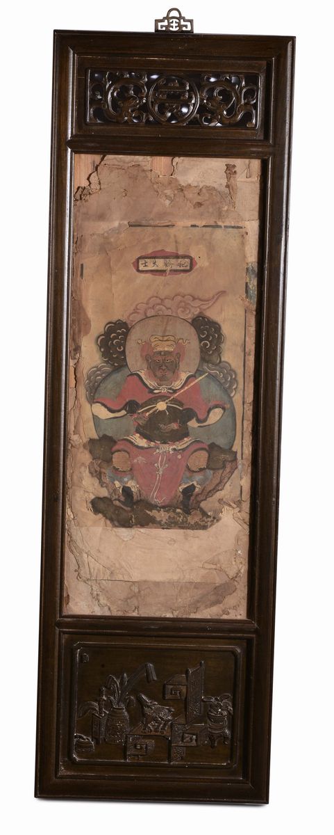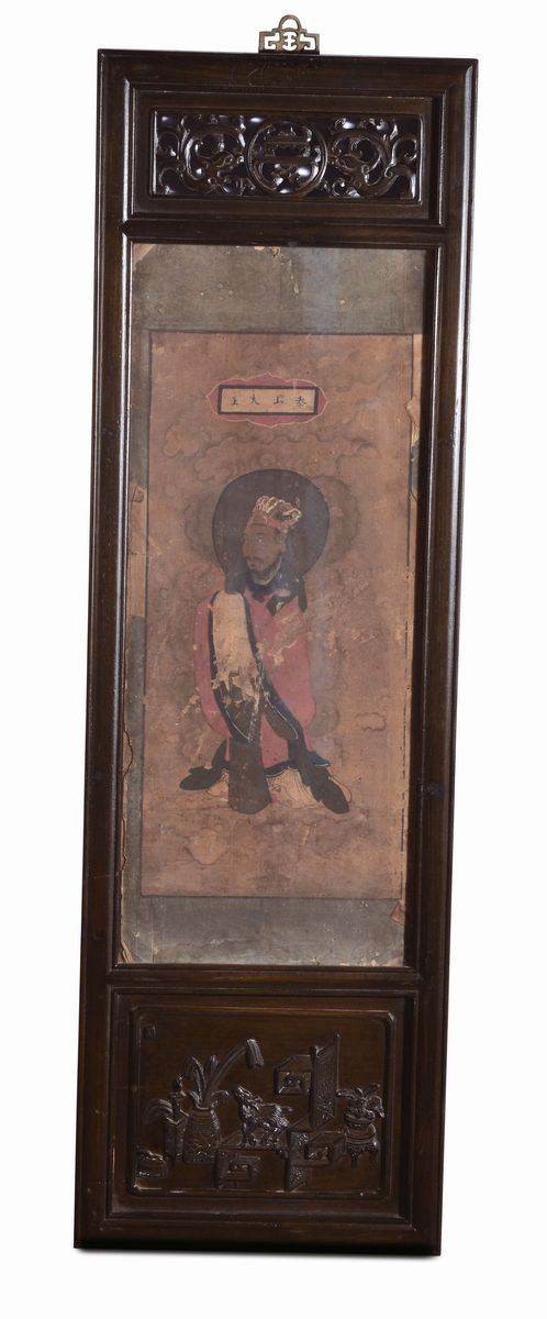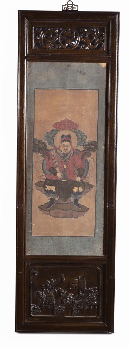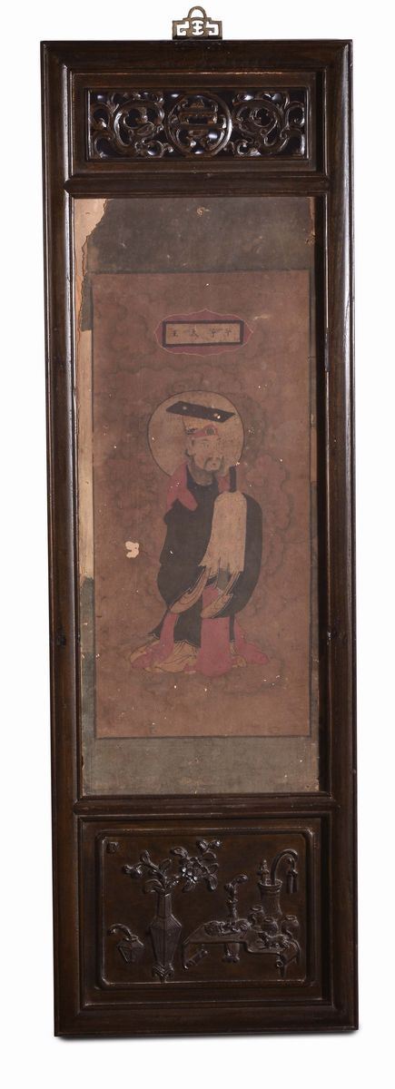 Sei dipinti con cornice intagliata in legno di Homu, CIna Dinastia Qing, XIX secolo, cm 32x102