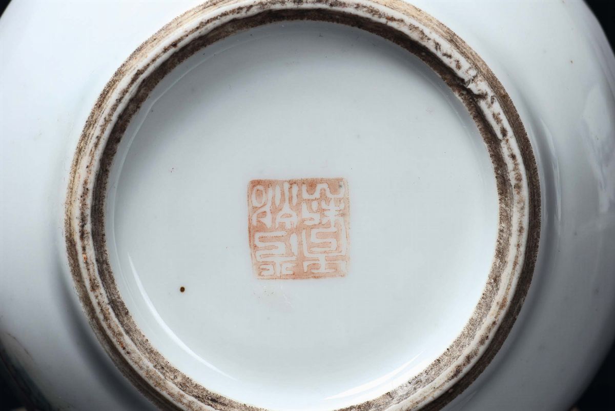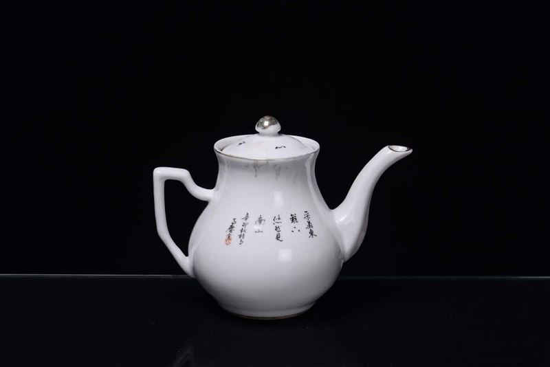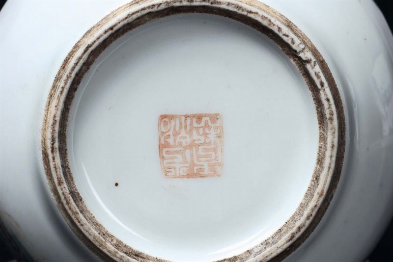 Teierina in porcellana policroma con figure e ideogrammi, Cina, Repubblica, XX secolo