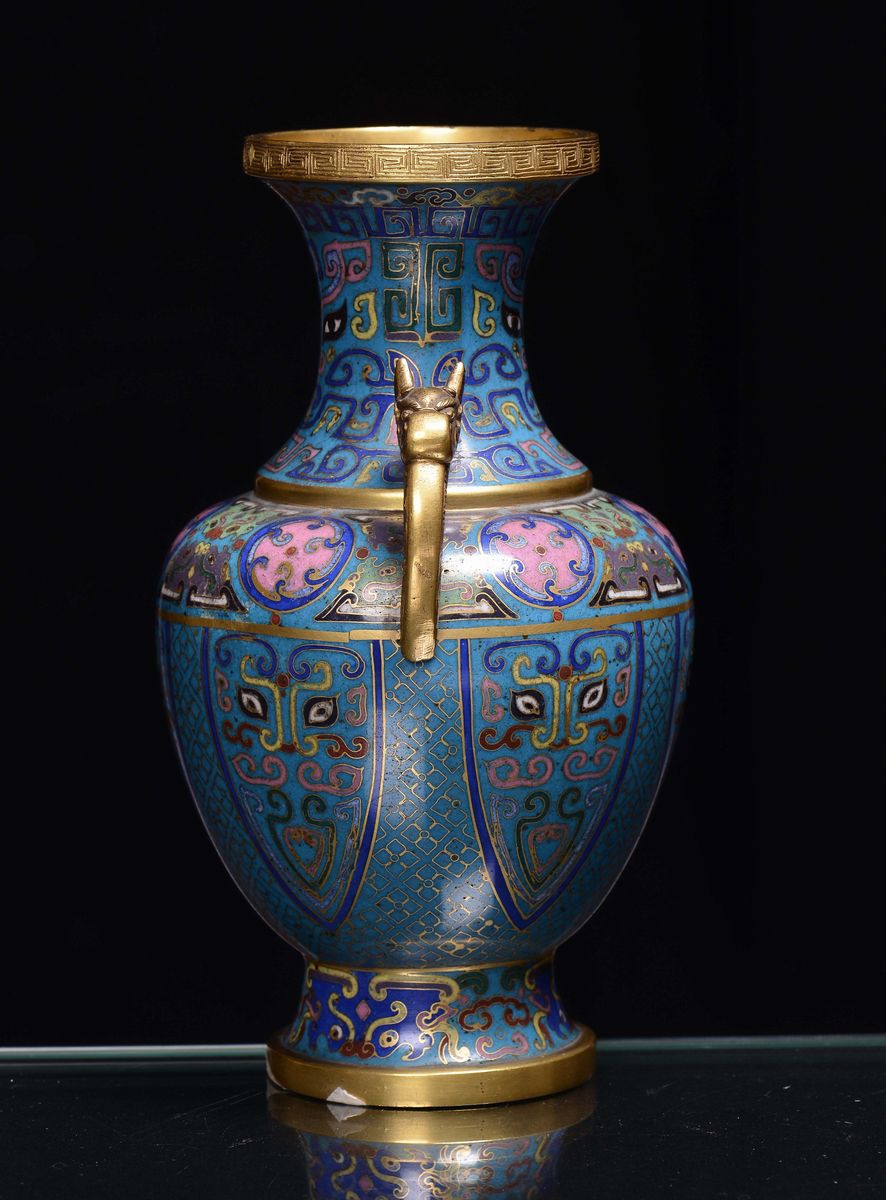 Vaso cloisonne in bronzo con manici e orlo dorati, Cina, Dinastia Qing, XIX secolo
