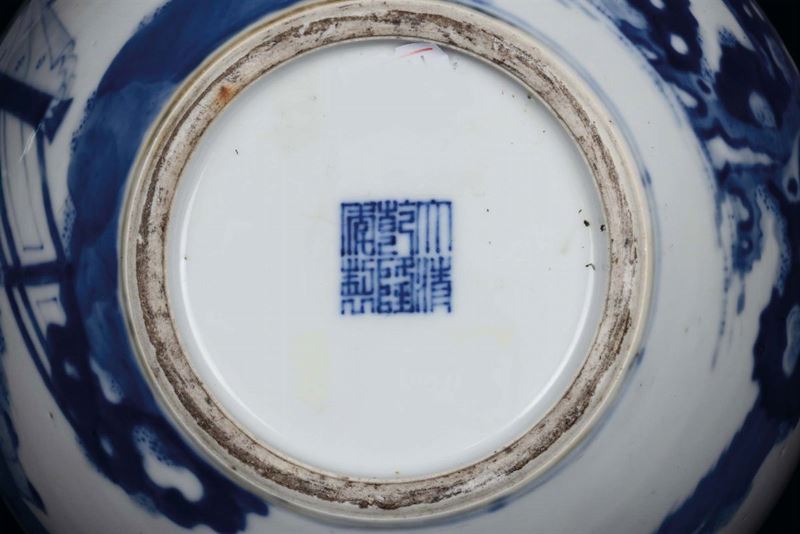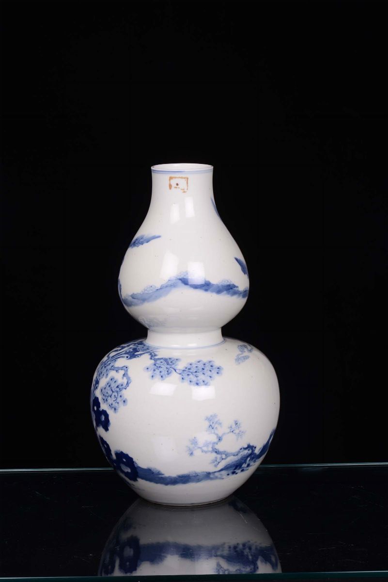 Vaso in porcellana bianca e blu a doppia zucca con figure, Cina XIX secolo