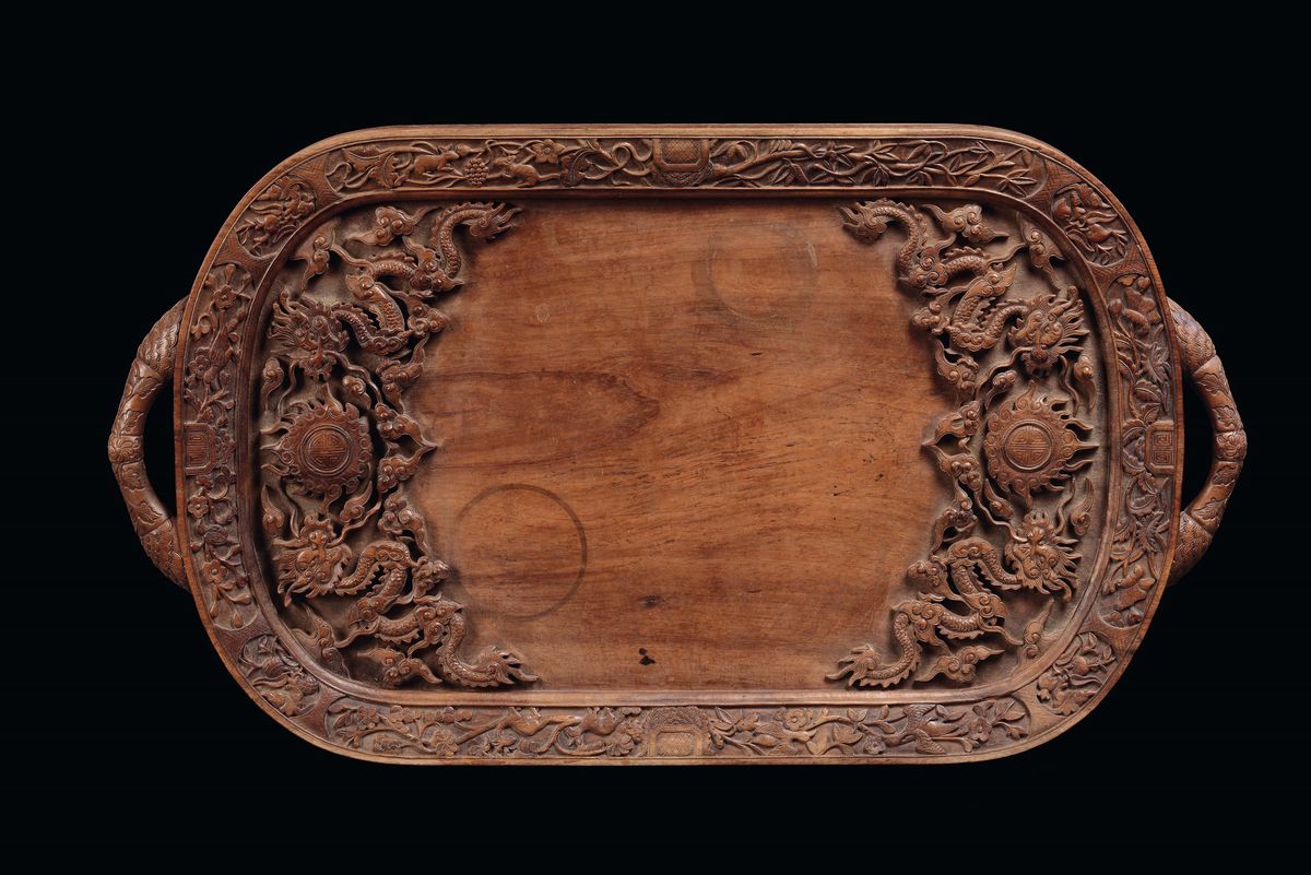 Vassoio a due manici in Huangwali riccamente intagliato con draghi, Cina, Dinastia Qing, XIX secolo