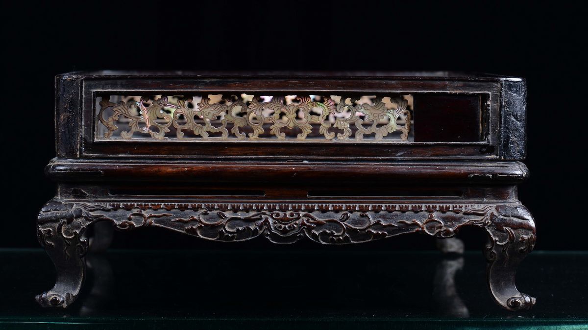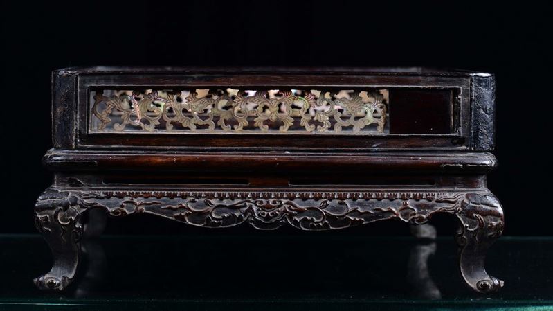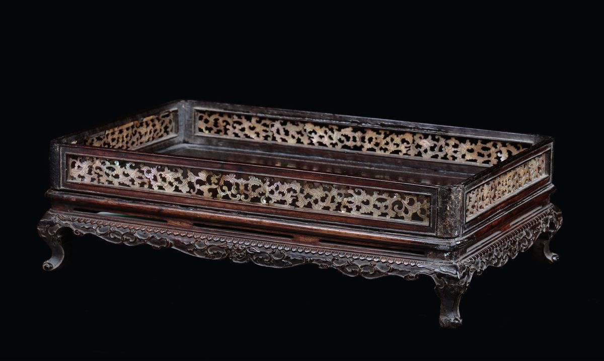Vassoio in legno di Zitan e madreperla finemente intagliato, Cina, Dinastia Qing, Periodo Qianlong (1736-1795)