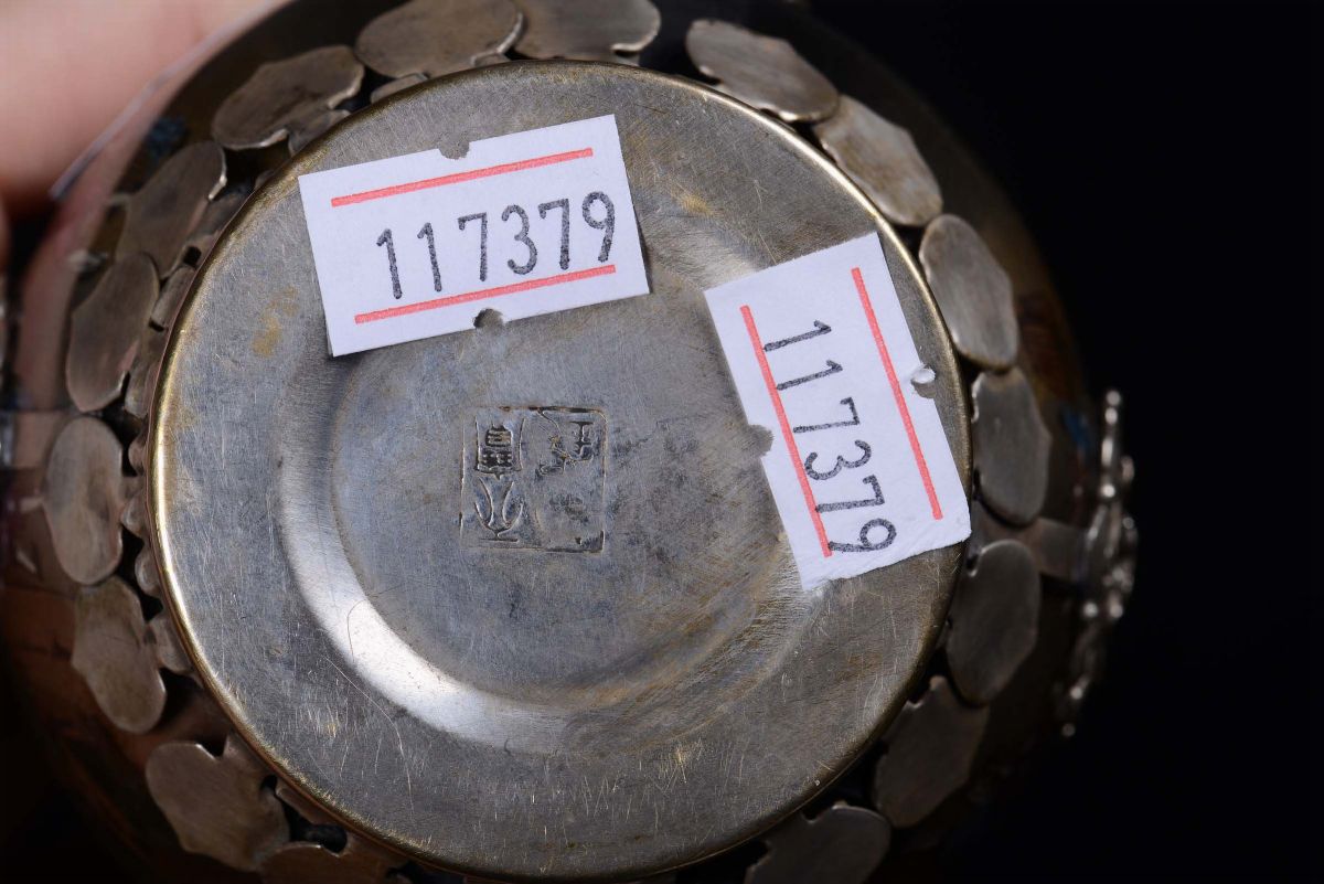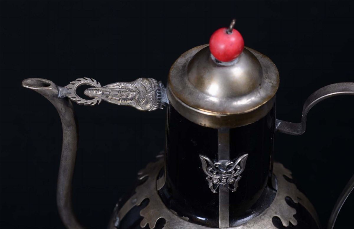 Piccola teiera in vetro e metallo decorata con figure e ideogrammi, fine XIX secolo