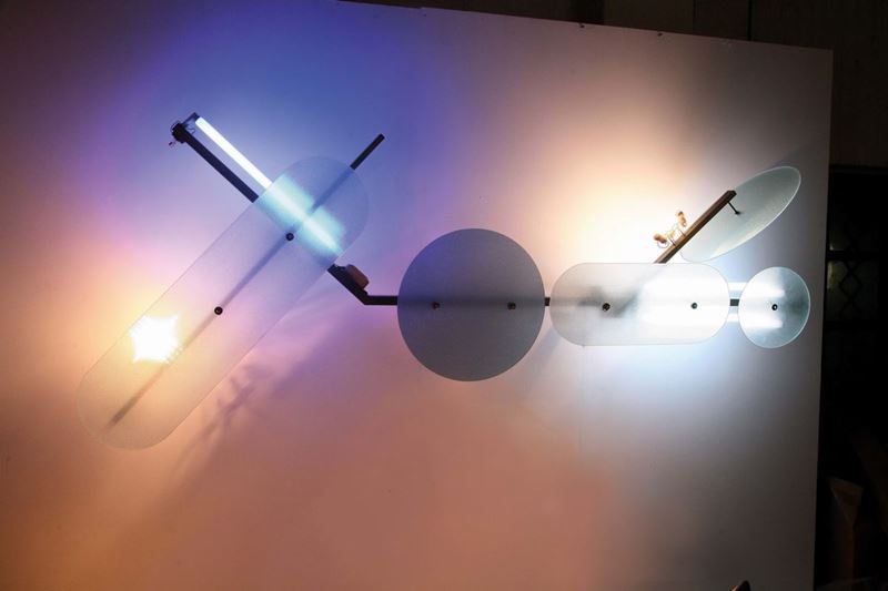 Lampada da sospensione Light Trees con struttura in profilato di ferro verniciato e vetri di protezione e diffusione smerigliati e stampati a diamante. Pezzo unico. Prod. Italia, 1970 ca. cm 40x255x100