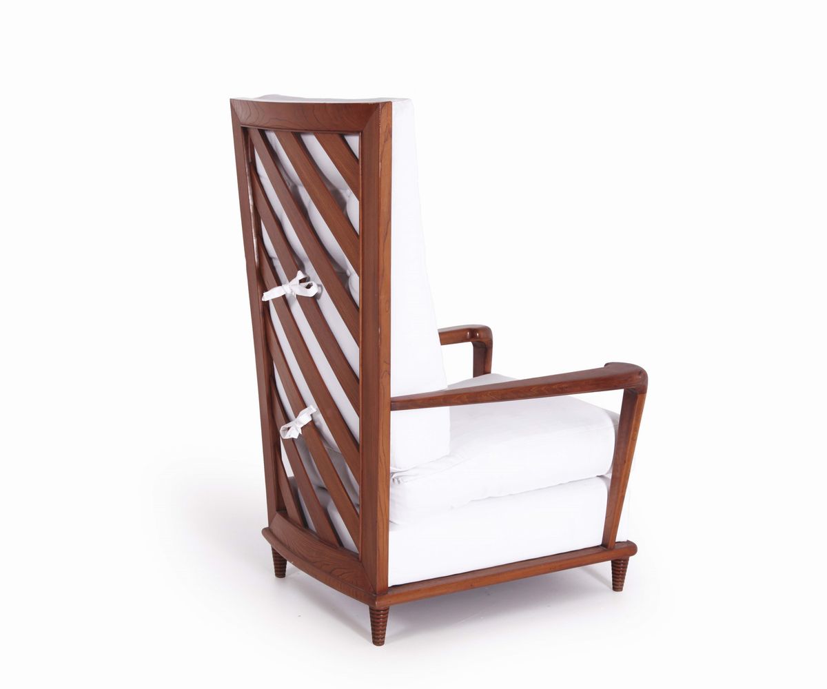 Grande poltrona in legno con cuscini in tessuto. Prod. Italia, 1940 ca. cm 120x71x83