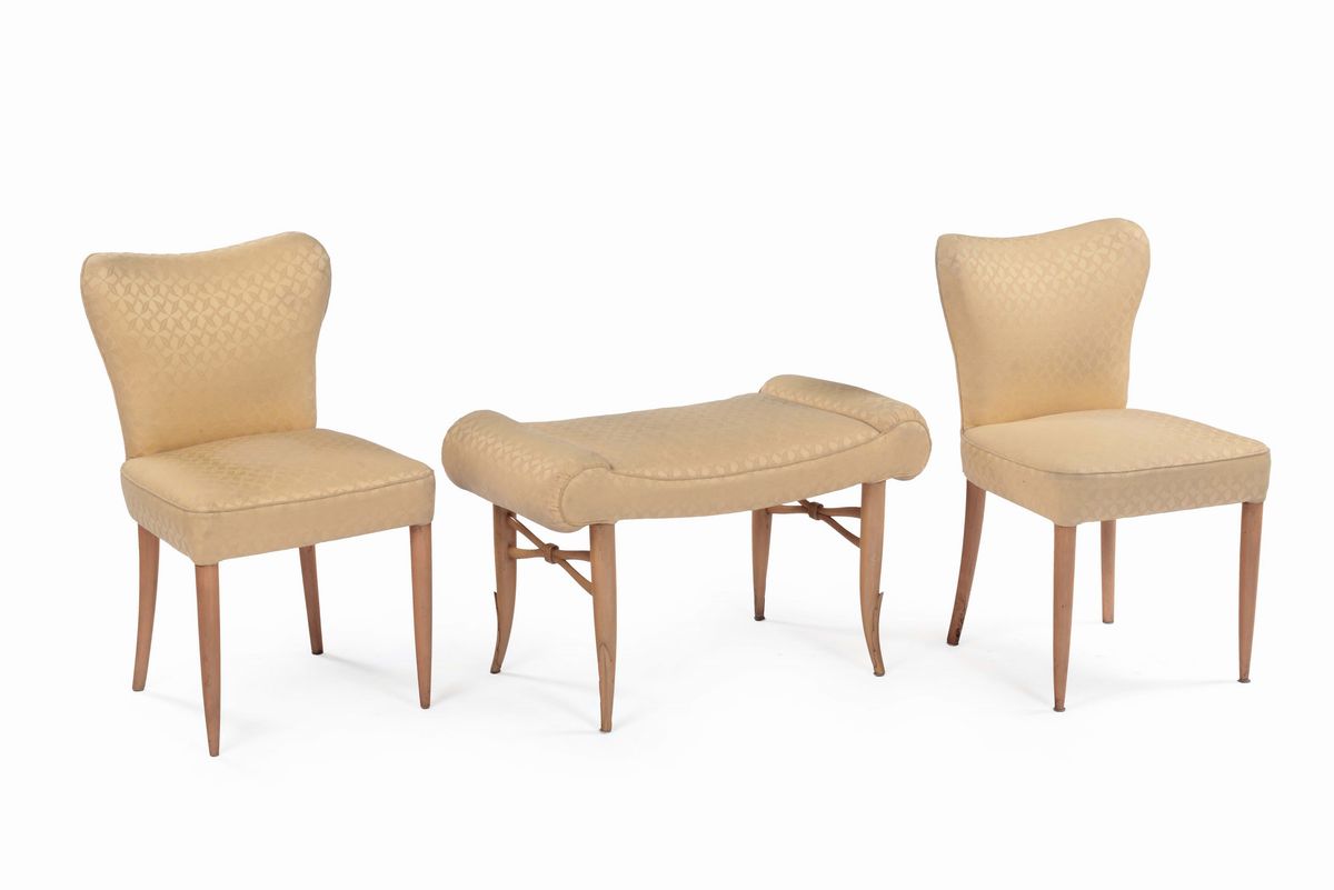 Toilette, sgabello e due sedie in citronie. Ripiano toilette in vetro e rivestimenti sedie e sgabello in stoffa. Prod. Italia, 1940 ca. cm 75x133x47