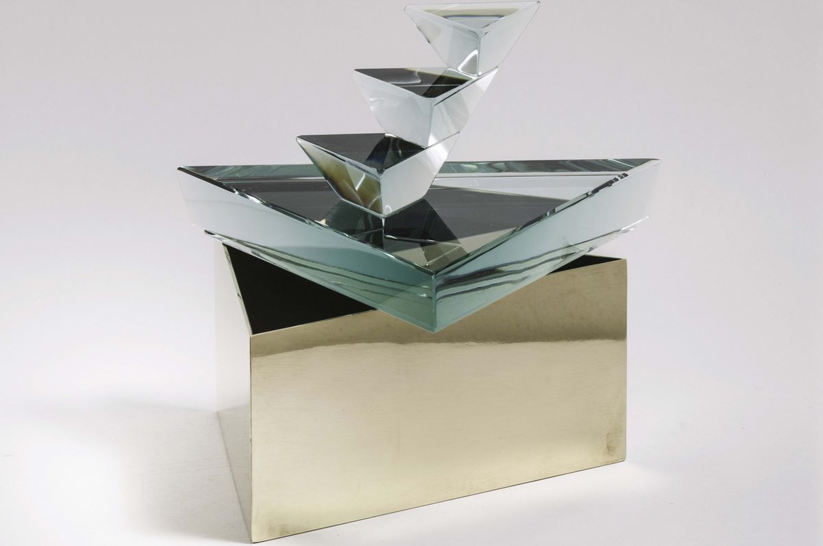 Tre scatole triangolari con corpo in ottone con interno in acciaio, coperchi in cristallo di alto spessore molati a mano. Firmati con logo. Prototipi. Prod. RGRida, Italia, 2013 cm 25x21; 23.5x21; 21x21