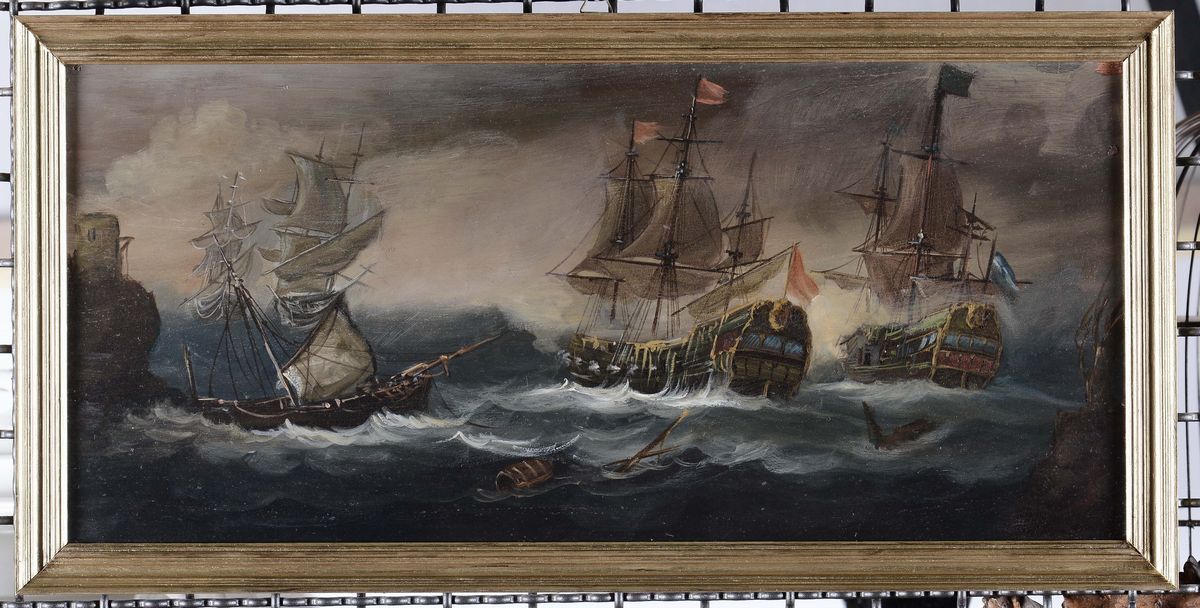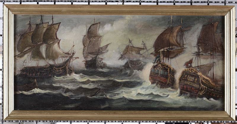coppia di dipinti ad olio su tavoletta, cm 21x48