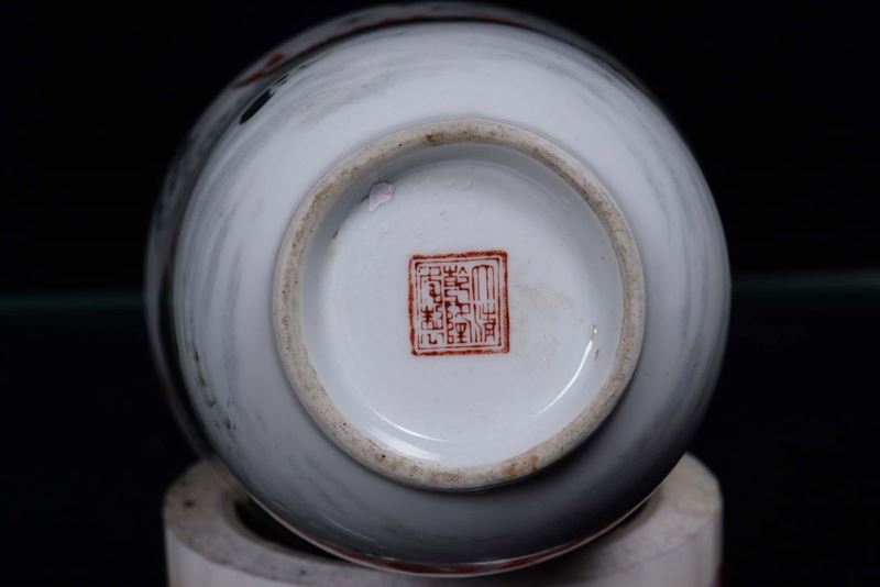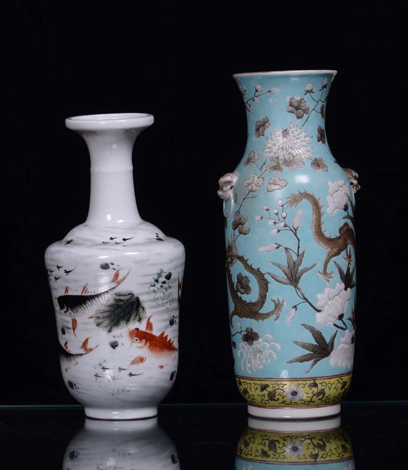 Bottiglia in porcellana con carpe e vaso con draghi a fondo turchese, Cina XX secolo