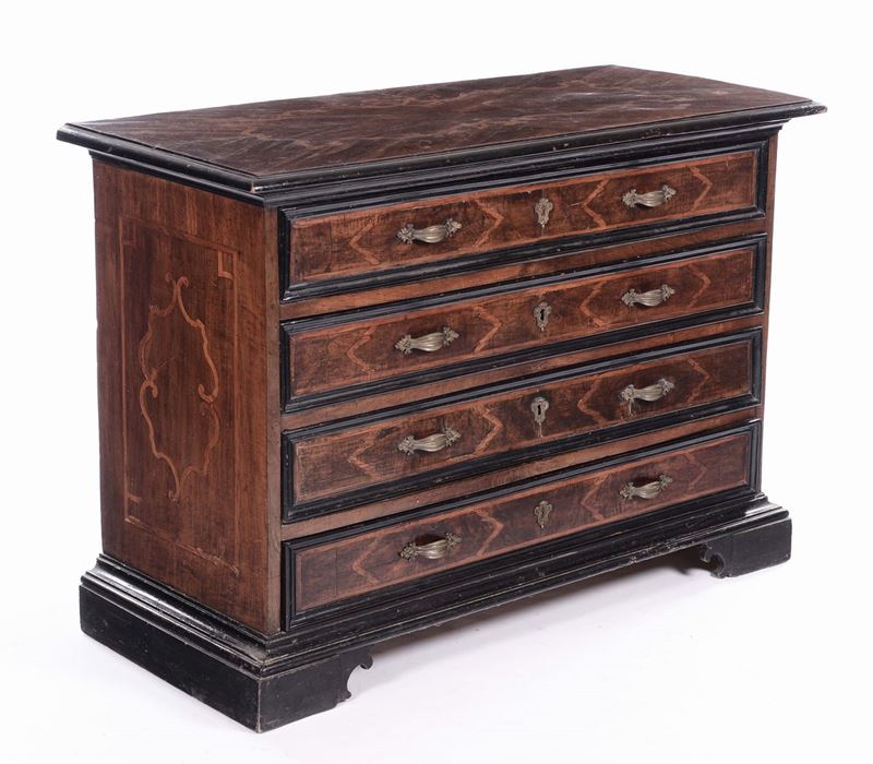 quattro cassetti con profili ebanizzati, piedi a mensola, cm 152x65x107