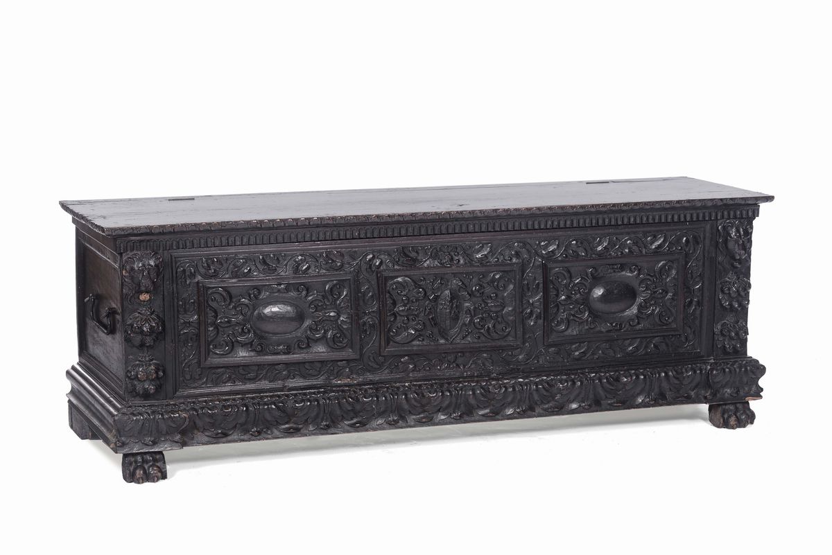 Cassapanca in legno ebanizzato con fronte intagliato, XVIII secolo