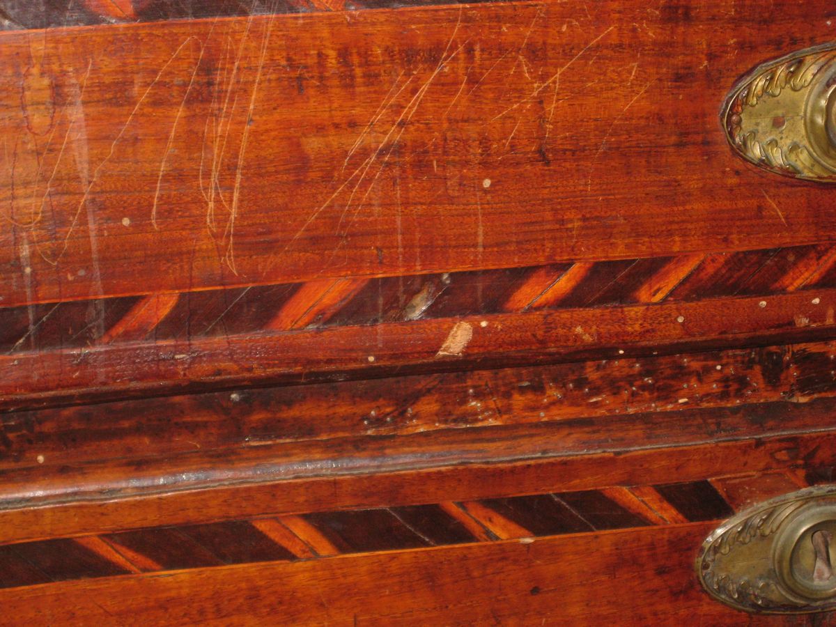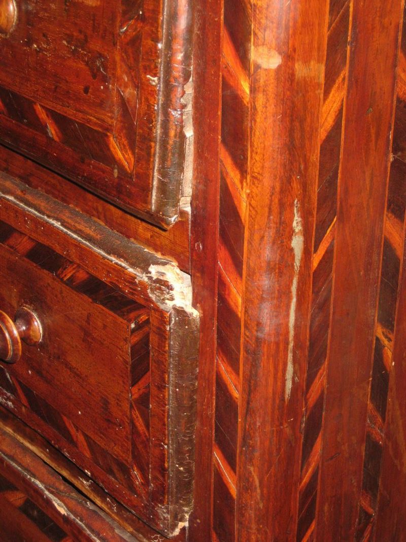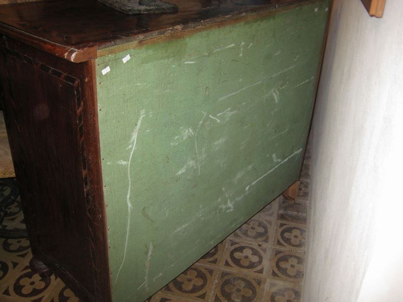 fronte e fianchi dritti, intarsi geometrici su cassetti, montanti e fianchi, cm 128x55x106 (difetti)