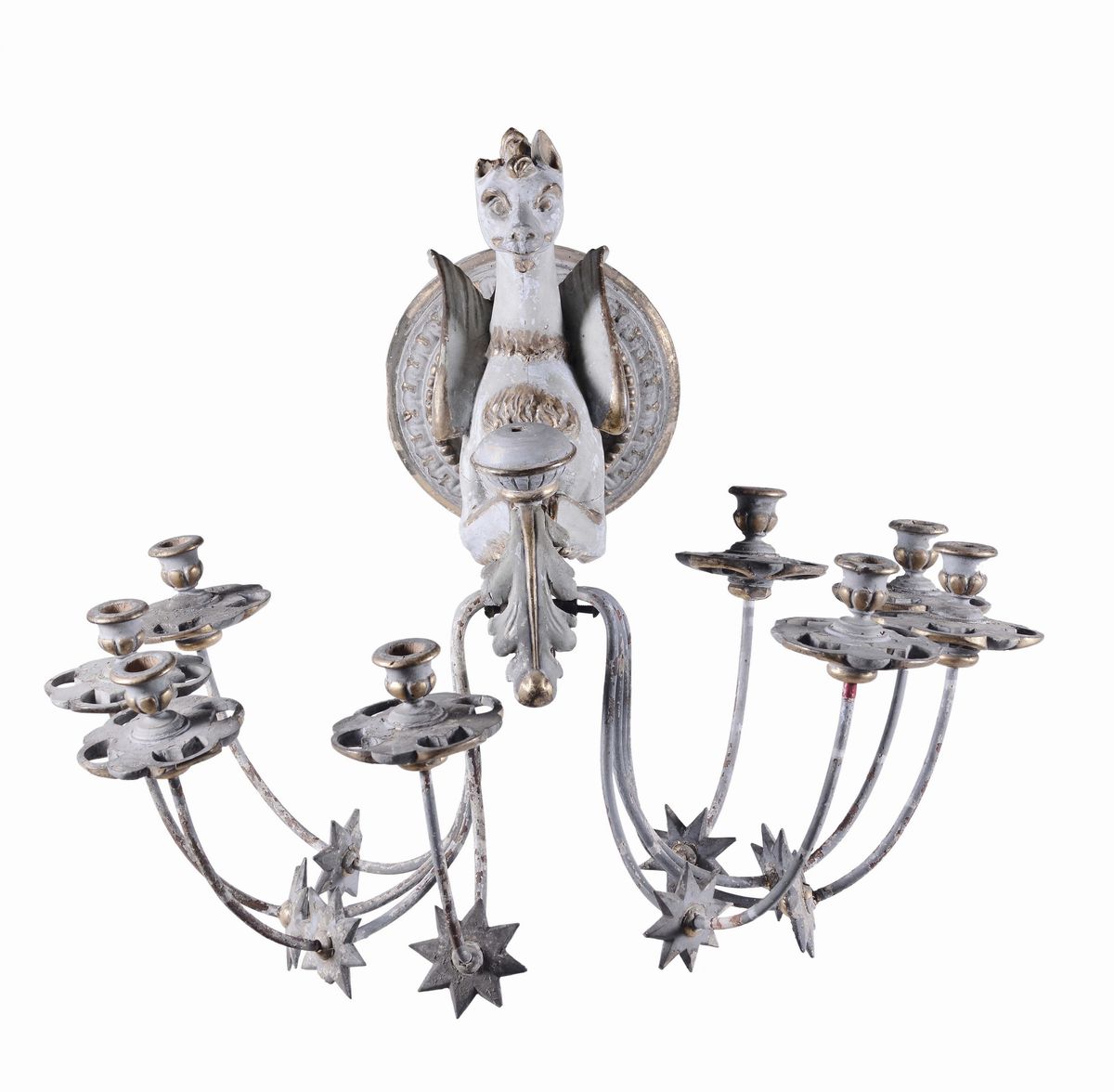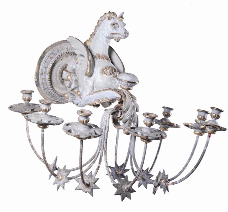 decoro con cavalli alati a tuttotondo a reggere otto bracci in metallo, cm 60x50x50 (difetti e mancanze)