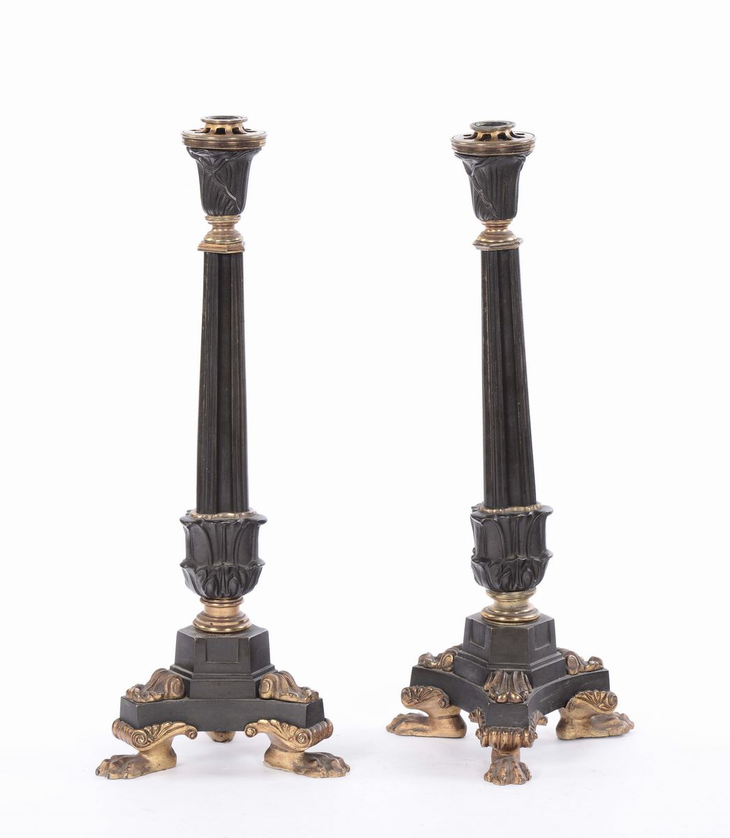 Coppia di candelieri Impero in bronzo brunito e dorato