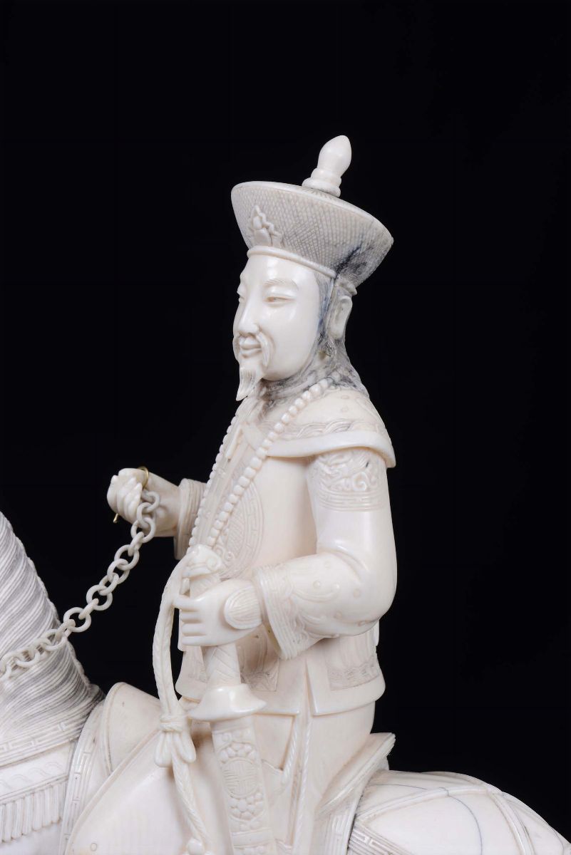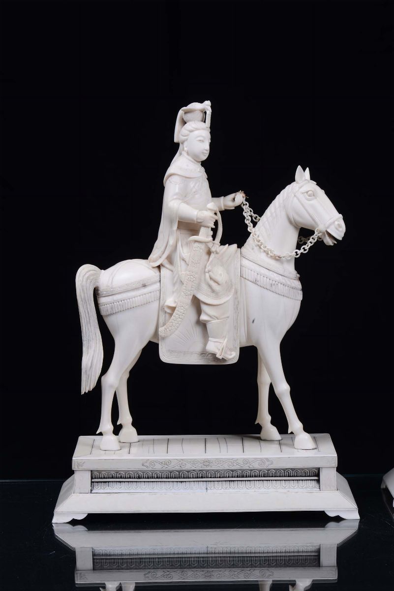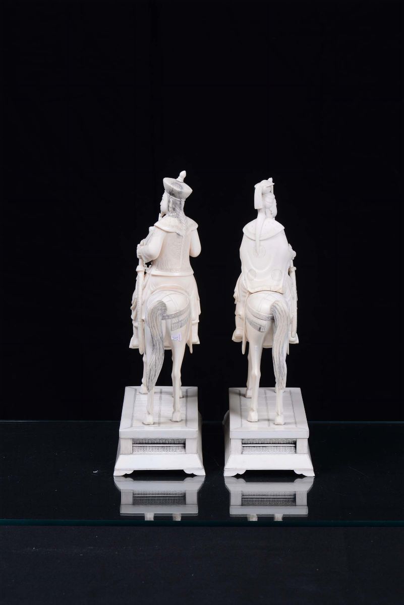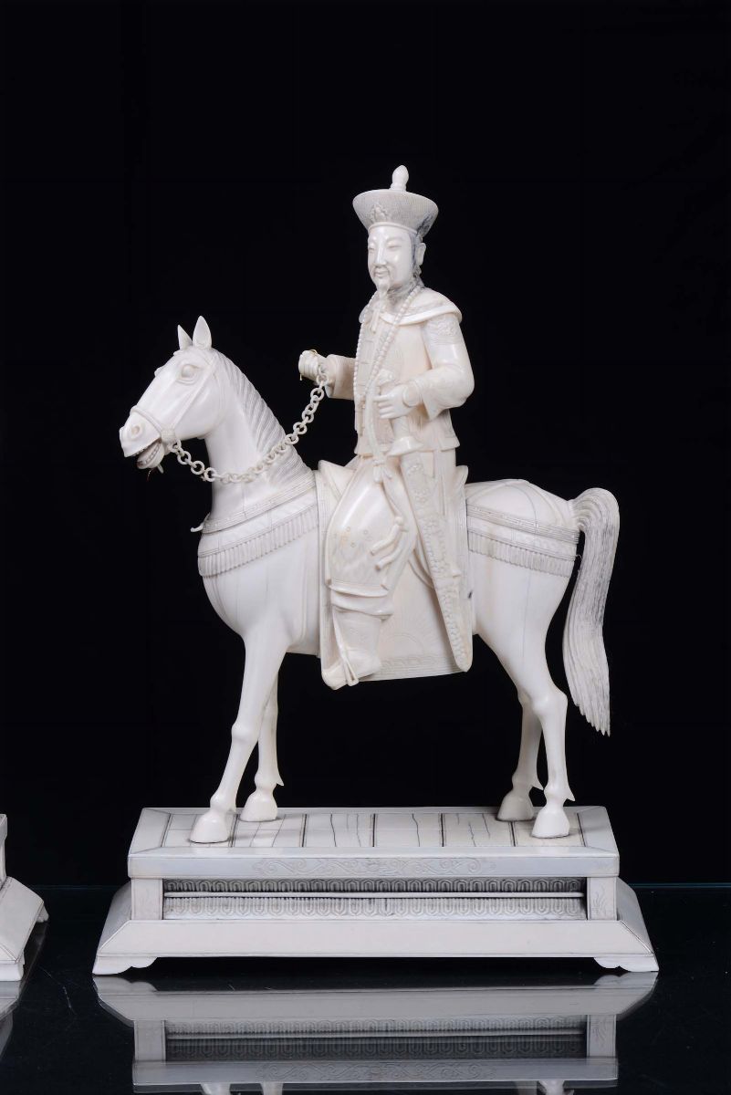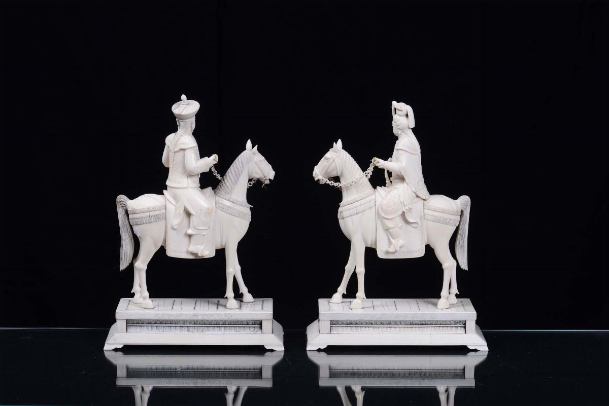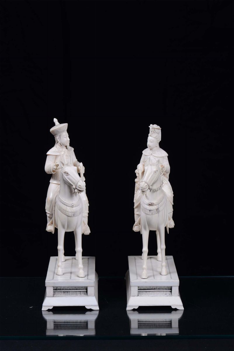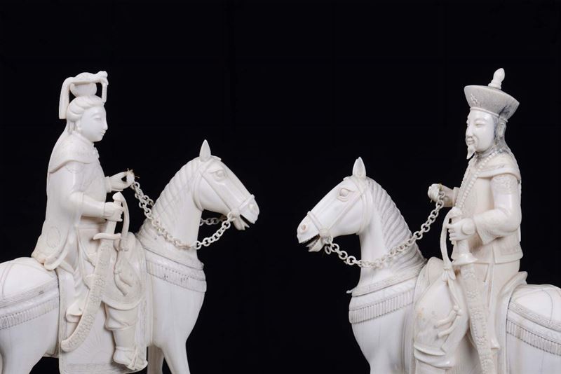 Coppia di dignitari a cavallo in avorio scolpito, Cina XX secolo