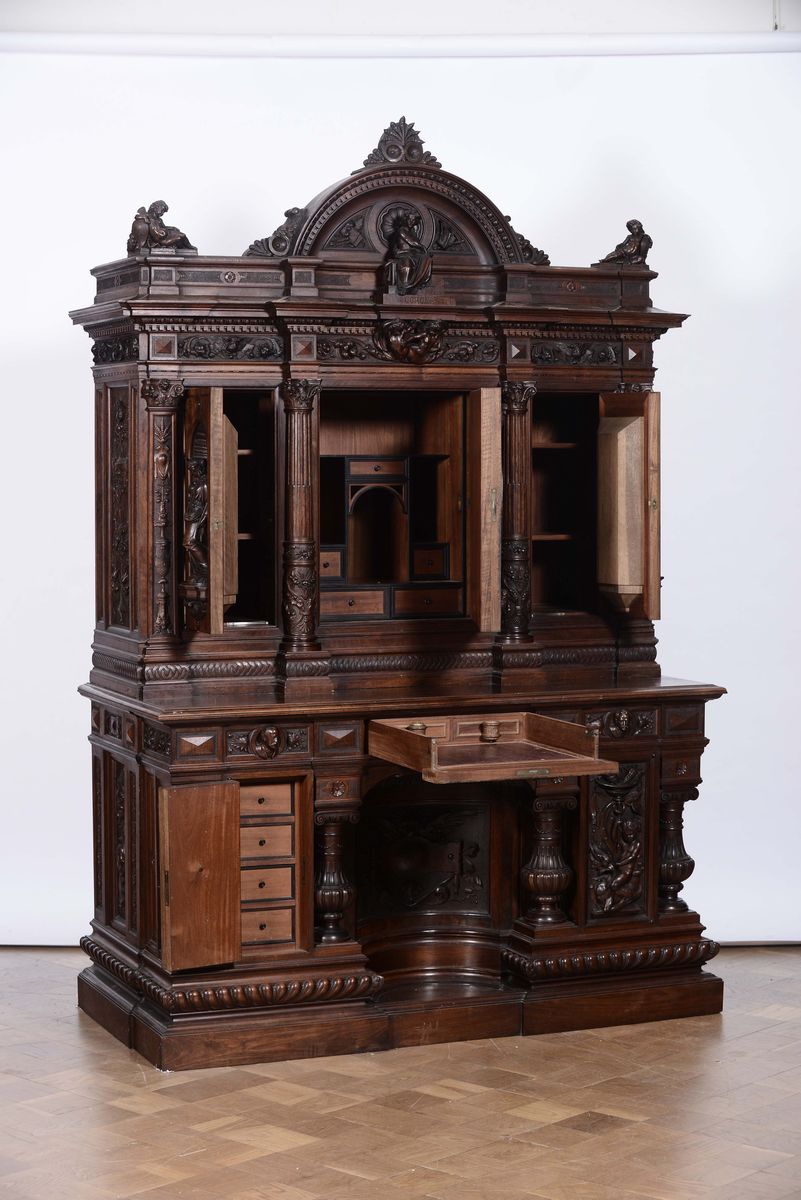 Importante credenza doppio corpo interamente scolpita con figure femminili a tuttotondo e numerosi altri elementi, sportelli che celano numerosi cassettini e scomparti segreti rivestiti in legno di acero, nella nicchia centrale fregio scolpito con la dicitura: “ Egisto Gajani fecit 1875”, cm 159x75x220