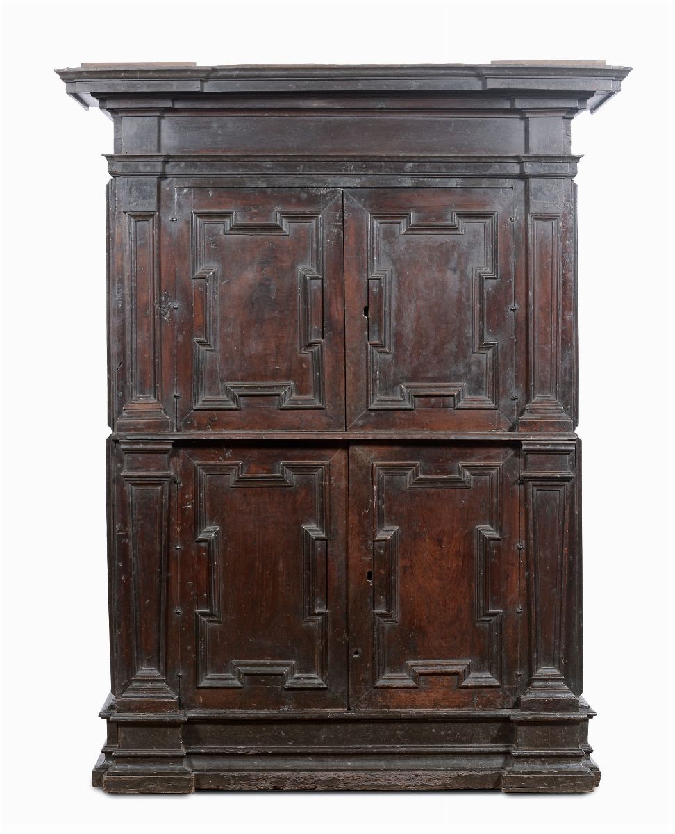 Grande credenza a due corpi in noce, castagno e legni vari, Emilia XVII secolo