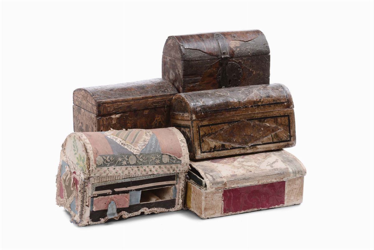 Gruppo di cinque cofanetti diversi di cui due in stoffa, XVII-XVIII secolo