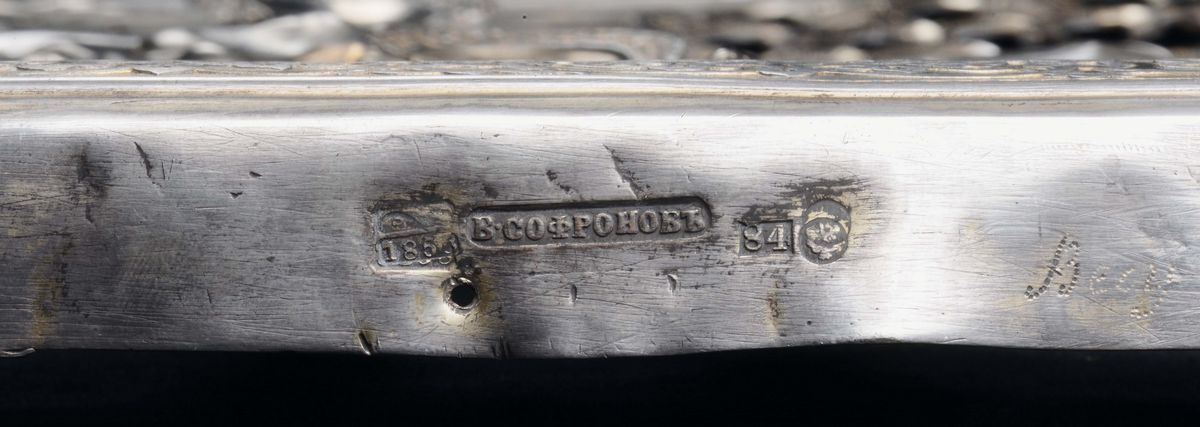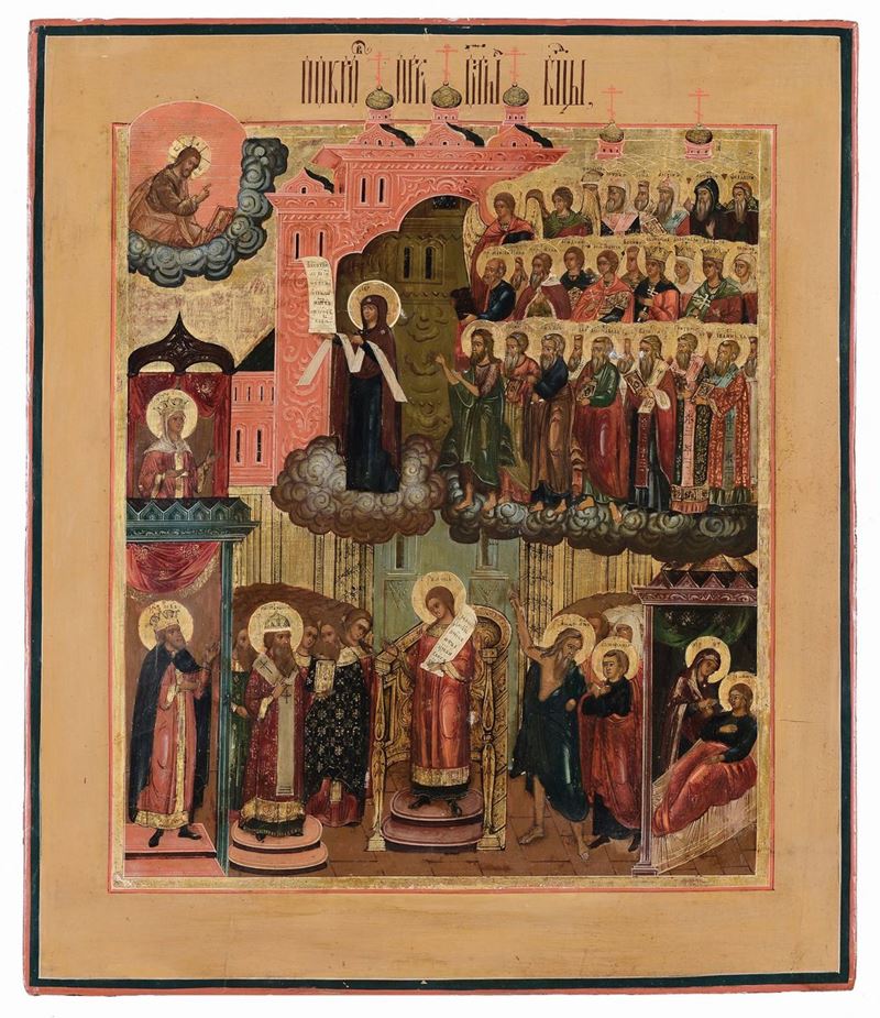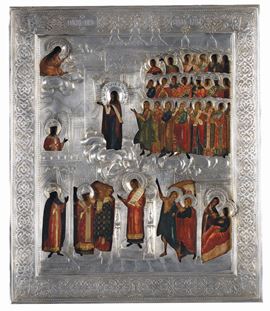 Icona con riza in argento raffigurante Santi e la Madonna di Pokrov, Russia