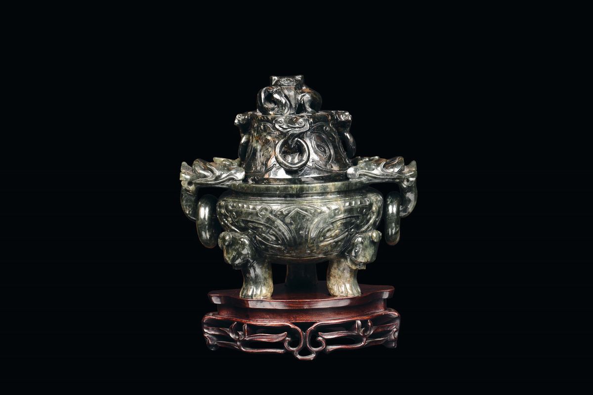 Incensiere con coperchio in giada verde spinacio scolpito di forma arcaica, Cina, XX secolo