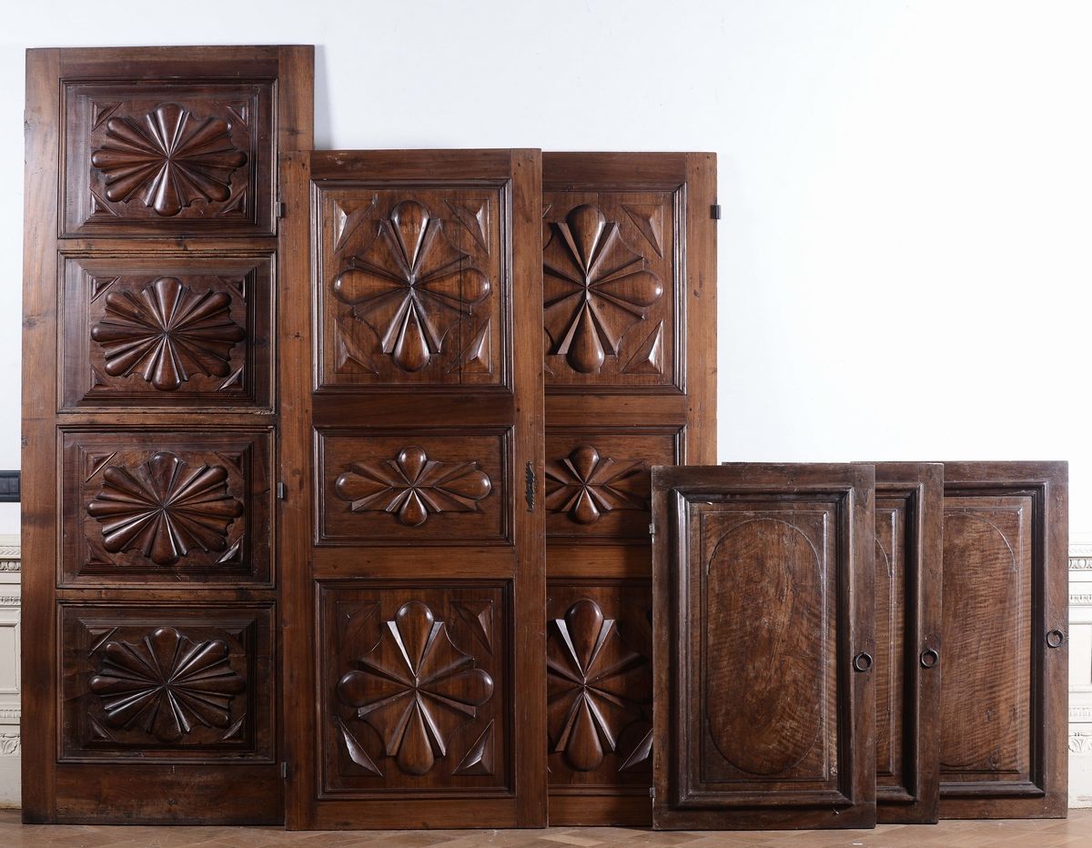 Insieme di ante pannellate in noce di forme e dimensioni diverse