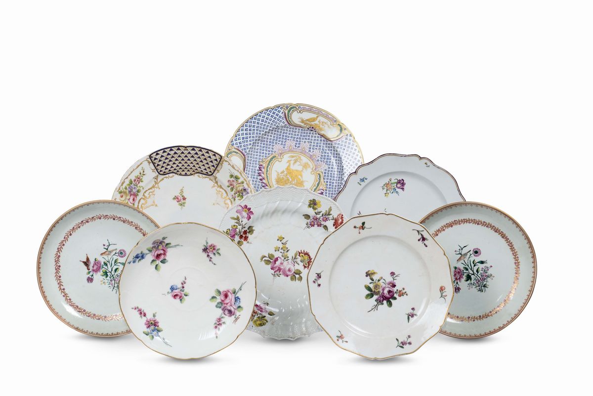 Lotto di otto piatti in porcellana differenti, XVIII-XIX Secolo