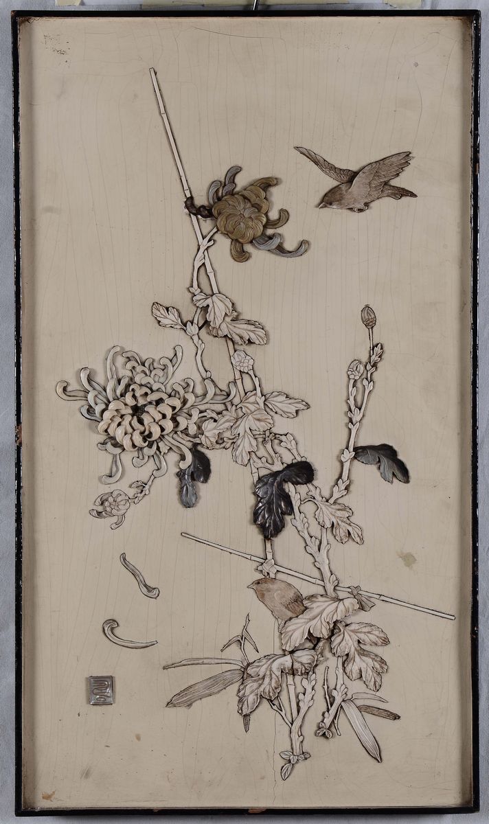 Pannello intagliato in avorio e madreperla, Giappone