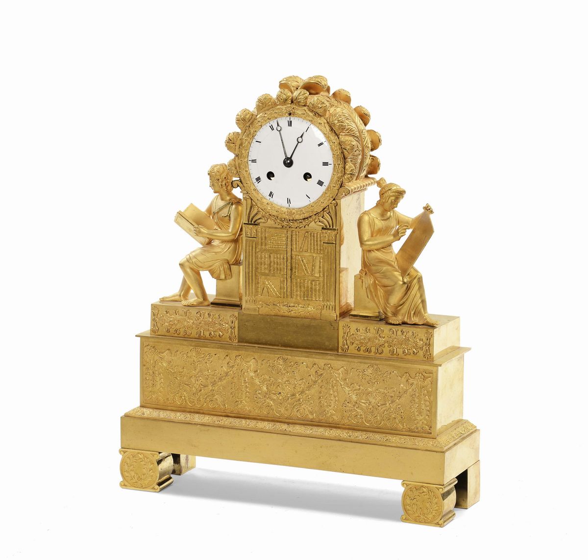Pendola in bronzo dorato raffigurante allegoria delle arti e delle scienze, XIX secolo