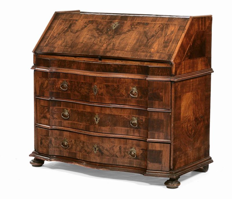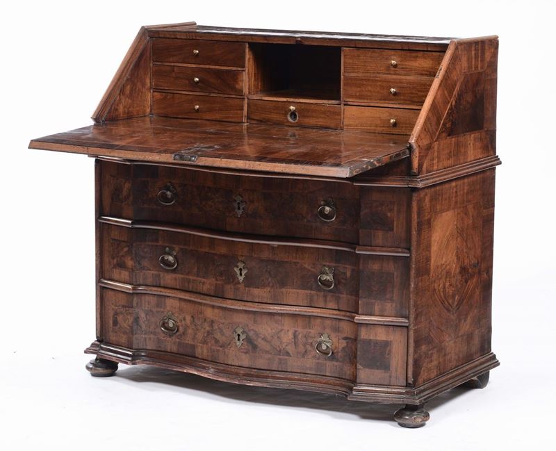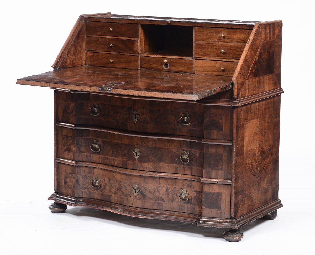 tre cassetti sotto la calatoia che cela cassettini e vano a giorno centrale, piedi a cipolla, cm 108x56x107
