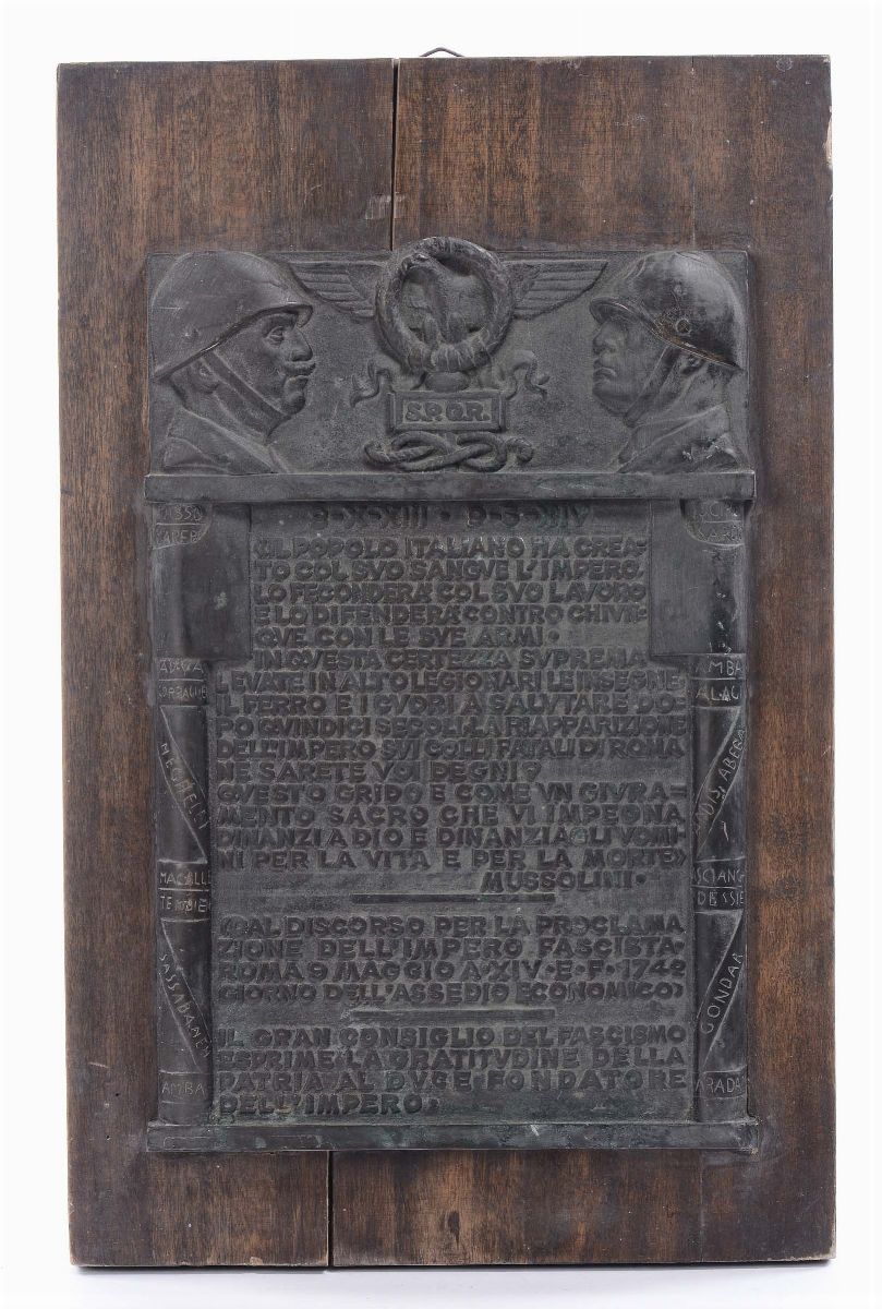 Targa in bronzo con iscrizione di epoca fascista
