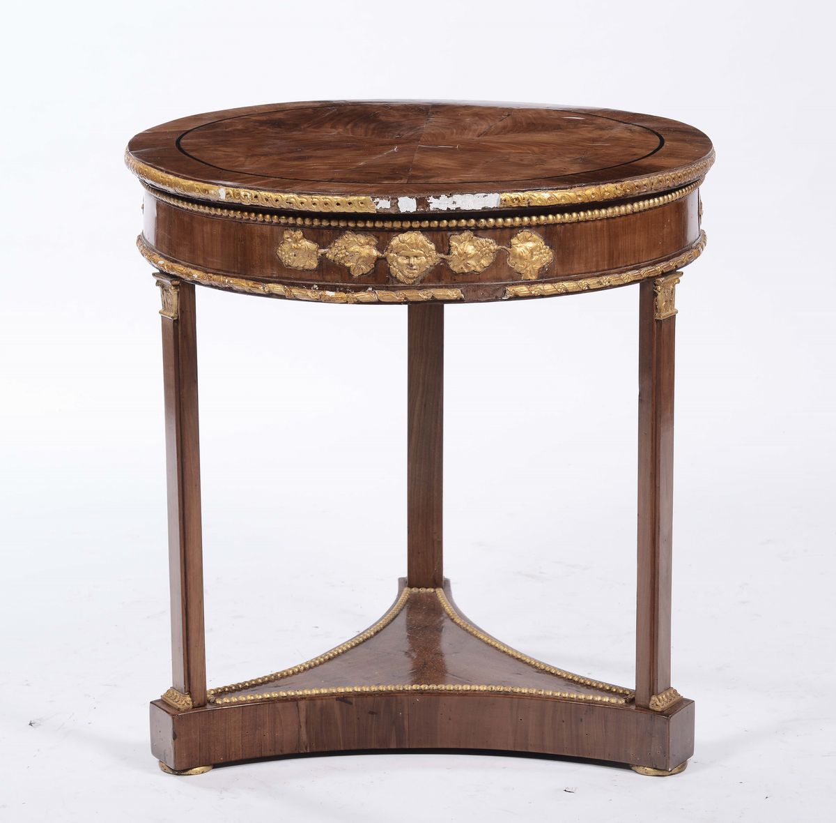 interamente lastronato con profili dorati, fascia decorata con testa di bacco e uva, altezza cm 77, diametro cm 74