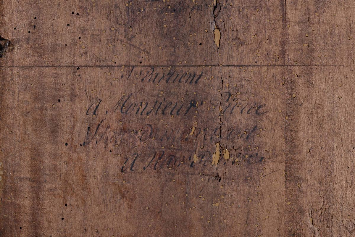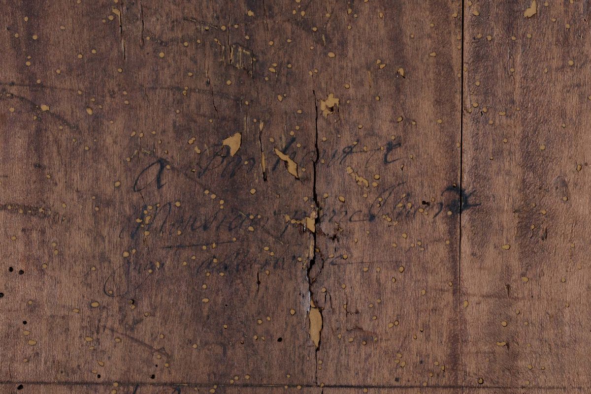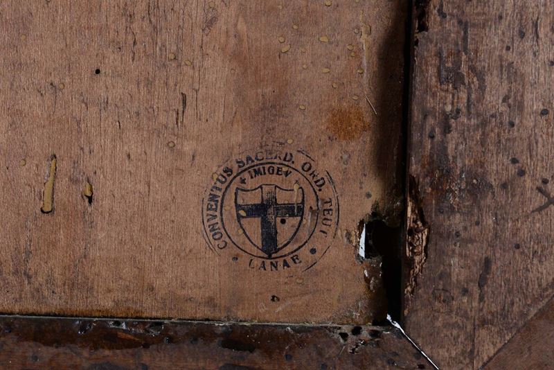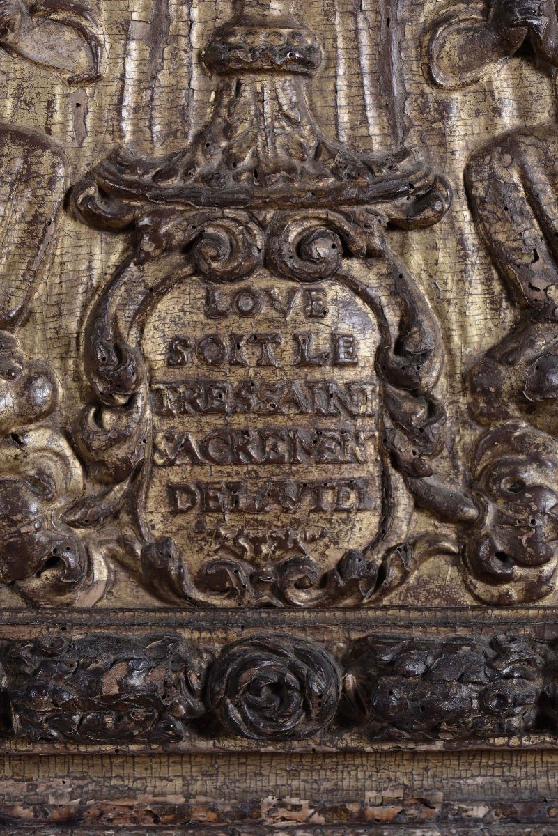 Il pannello, che simboleggia l'Eucarestia racchiuso in una cornice a festoni, è finemente scolpito con raffigurazioni di angeli genuflessi e in volo, raccolti attorno alla Sacra Ostia. L'opera appartiene alla produzione artistica francese, ispirata dalle influenze tardo-manieriste della scuola di Fontainebleau, ed è, nel suo spirito celebrativo, testimonianza storica e religiosa della contrapposizione tra cattolici ed ugonotti, che negavano questo sacramento, culminata con la notte di S,Bartolomeo del 24 agosto 1572, che segnò l'eccidio di questi ultimi.