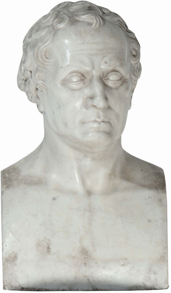 Busto virile neoclassico rappresentato all'antica su colonna in legno dipinto a marmorizzazione.