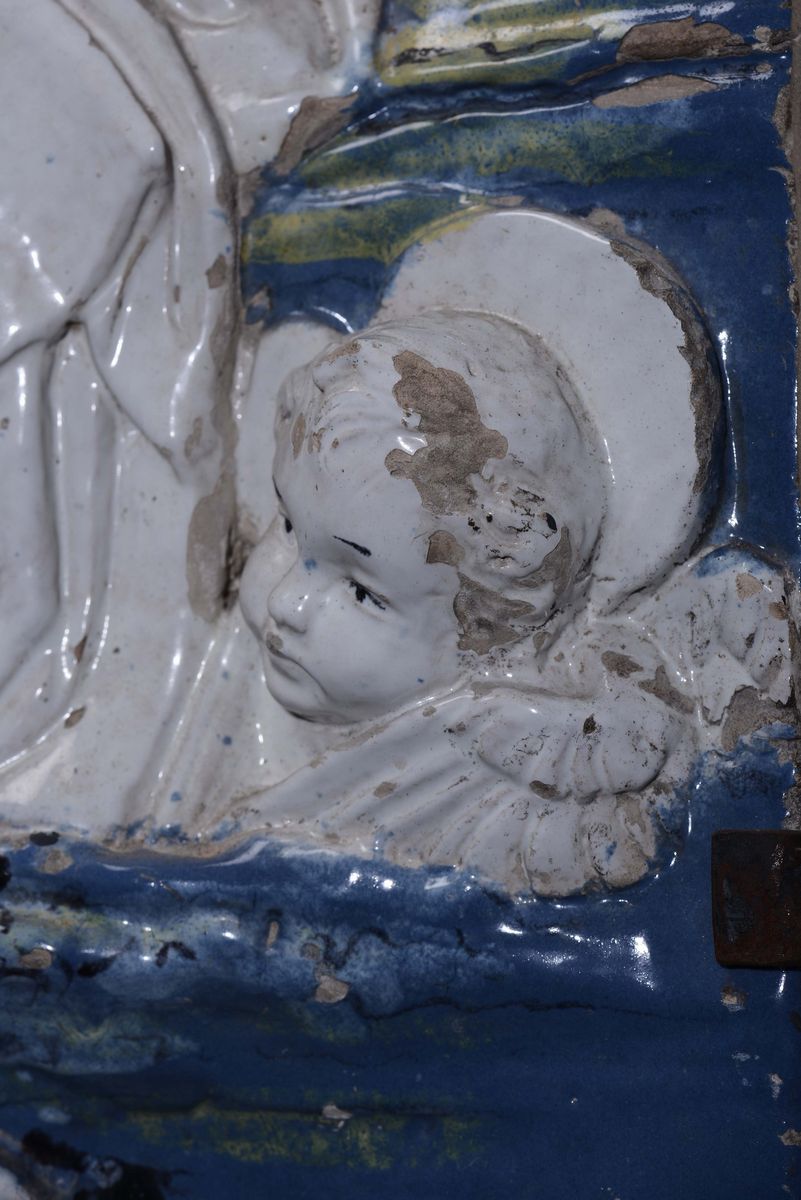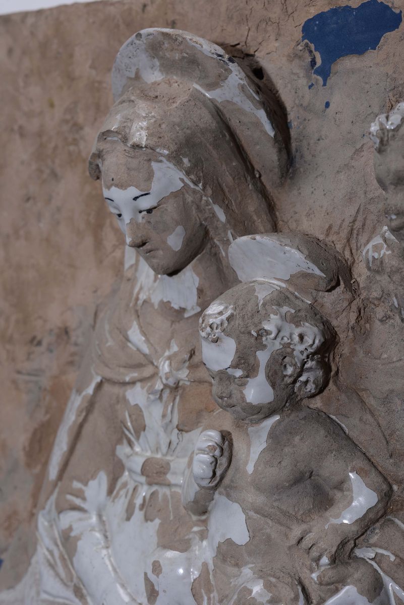 Piastra in terracotta smaltata con raffigurazione della Madonna assisa e Gesù Bambino benedicente in grembo. L'iconografia deriva dalla lettura dell'immagine sacra e dalle tecniche esecutive sviluppate nel mondo dei Della Robbia della Firenze quattrocentesca. Cfr:I Della Robbia e l'arte nuova della scultura invetriata. Catalogo mostra a cura di G.Gentilini, Basilica di S.Alessandro, Fiesole 1998, ed. Giunti.