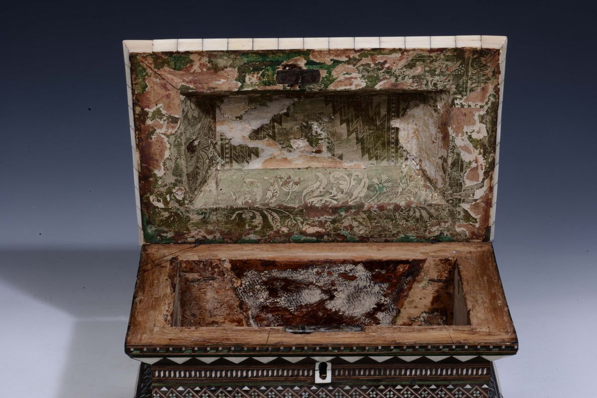 Il bel cofanetto, in ottimo stato di conservazione, presenta un coperchio ad urna dalla forma aggettante che richiude il contenitore poggiando su un cornicione sporgente decorato a tessere triangolari. La fascia, intarsiata con motivi geometrici alla certosina, poggia su un largo basamento triangolare terminante con una cornice modanata. L'opera è un significativo esempio dell'abilità stilistica, compositiva e cromatica della produzione quattrocentesca ascrivibile alla celebre manifattura degli Embriaci, apprezzata e diffusa in tutta Europa. Cfr:Tra/e teche, pissidi, cofani e forzieri dall'alto Medioevo al Barocco, P.Lorenzelli e A.Veca. Catalogo mostra galleria Lorenzelli, Bergamo 1985.
