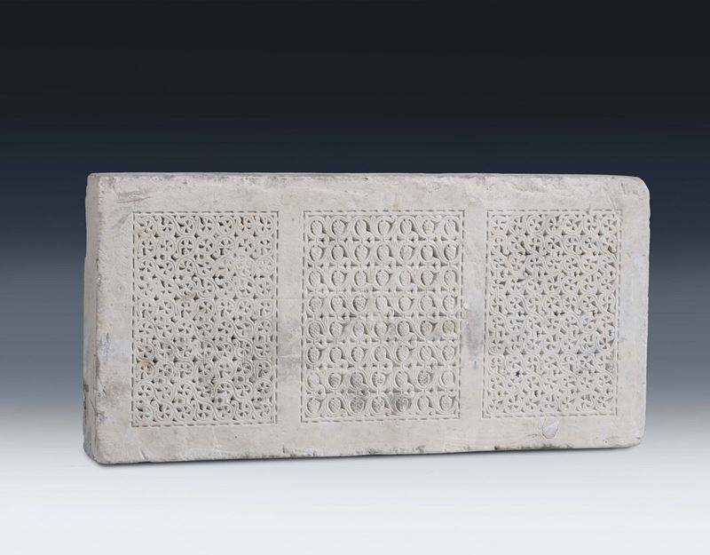 l'elemento architettonico, facente parte di una balaustra che divideva il presbiterio dal resto della chiesa in età romanica, scolpito da entrambi i lati è tripartito in riserve rettangolari raffigurate con motivi geometrici, naturalistici e girali che derivano dalla contaminazione di modelli stilistici del vicino oriente importati in Europa attraverso influenze bizantine e paleocristiane.