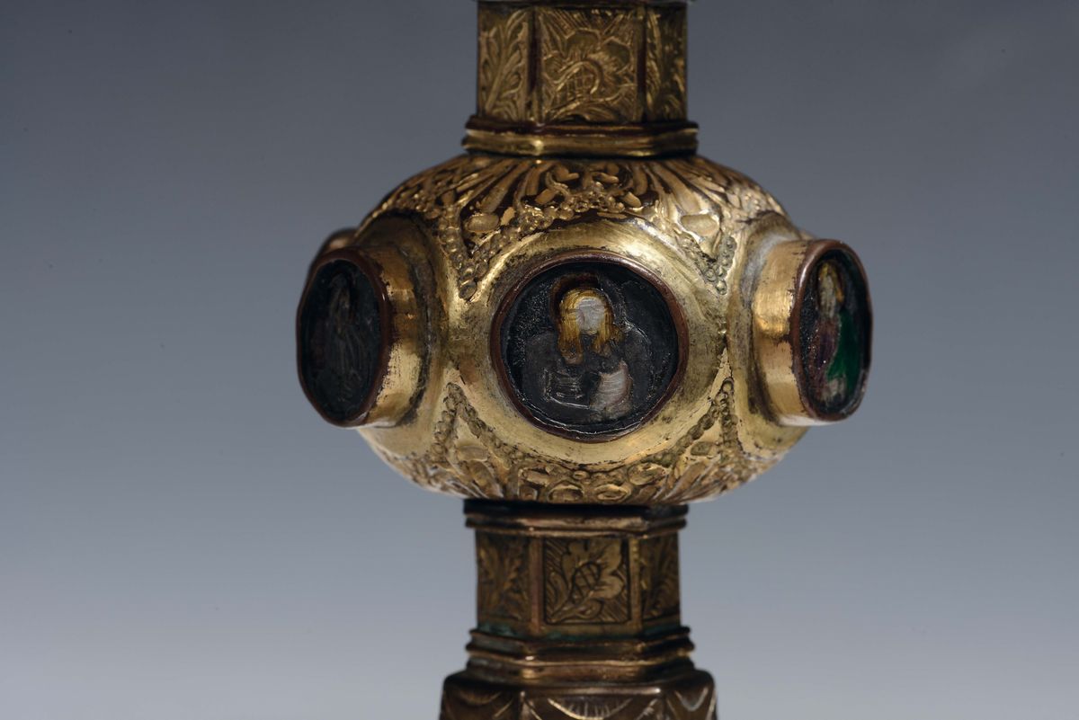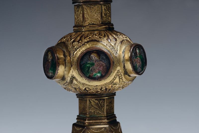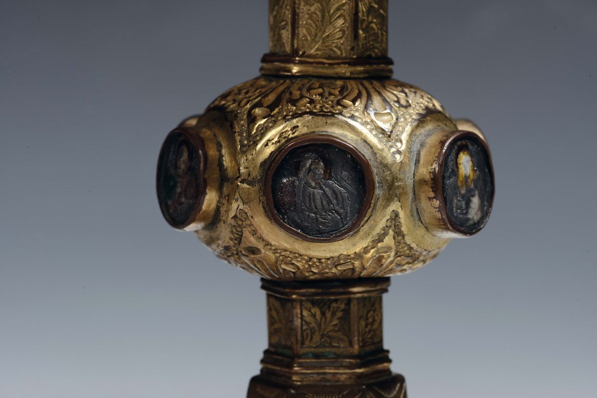 bronzo e rame fuso, sbalzato, cesellato e dorato. Altezza cm 32 (restauri e sostituzioni)