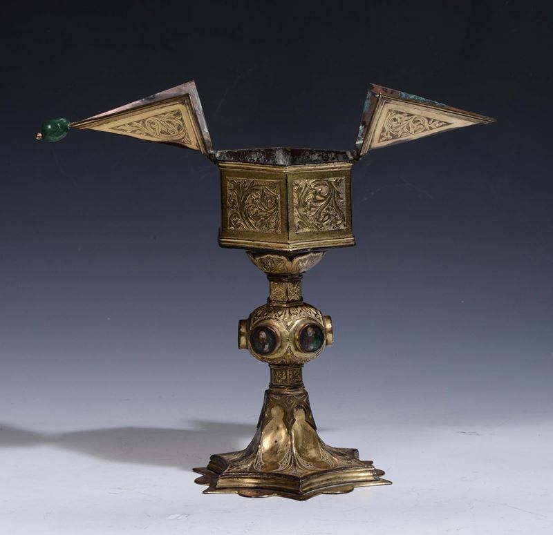 Parte superiore con cuspide bivalva a riserve triangolari unita da cerniere al corpo di forma esagonale con specchiature quadrate incorniciate ed incise con motivi a girali e racemi ripetuti anche nella cuspide. L'attaccatura del fusto, anch'esso esagonale e cesellato, è formata da elementi fogliacei. Al centro dello stelo un nodo, di forma sferica schiacciata inciso con foglie d'acanto, con sei chiodi contenenti placchette in argento cesellato ed inciso con le raffigurazioni religiose ricoperte da smalti colorati. Piede di forma mistilinea polilobata con riserve a specchio e decori cesellati a ogivali e racemi. La prudenza nello stabilire la funzione liturgica di questa opera di oreficeria è dovuta alla rarità delle pissidi di epoca tardogotica, una di epoca più antica è conservata nel museo cristiano di Brescia, che la rende oggetto raro e significativo della produzione di oreficeria religiosa tra il XV e il XVI secolo. Letteratura: L'oreficeria in Lombardia di Oleg Zastrow, ed.: Electa 1978 Oreficerie toscane medioevali e rinascimentali nella collezione Raspini di Chiara Sabbadini Sodi ed.: Polistampa 2009