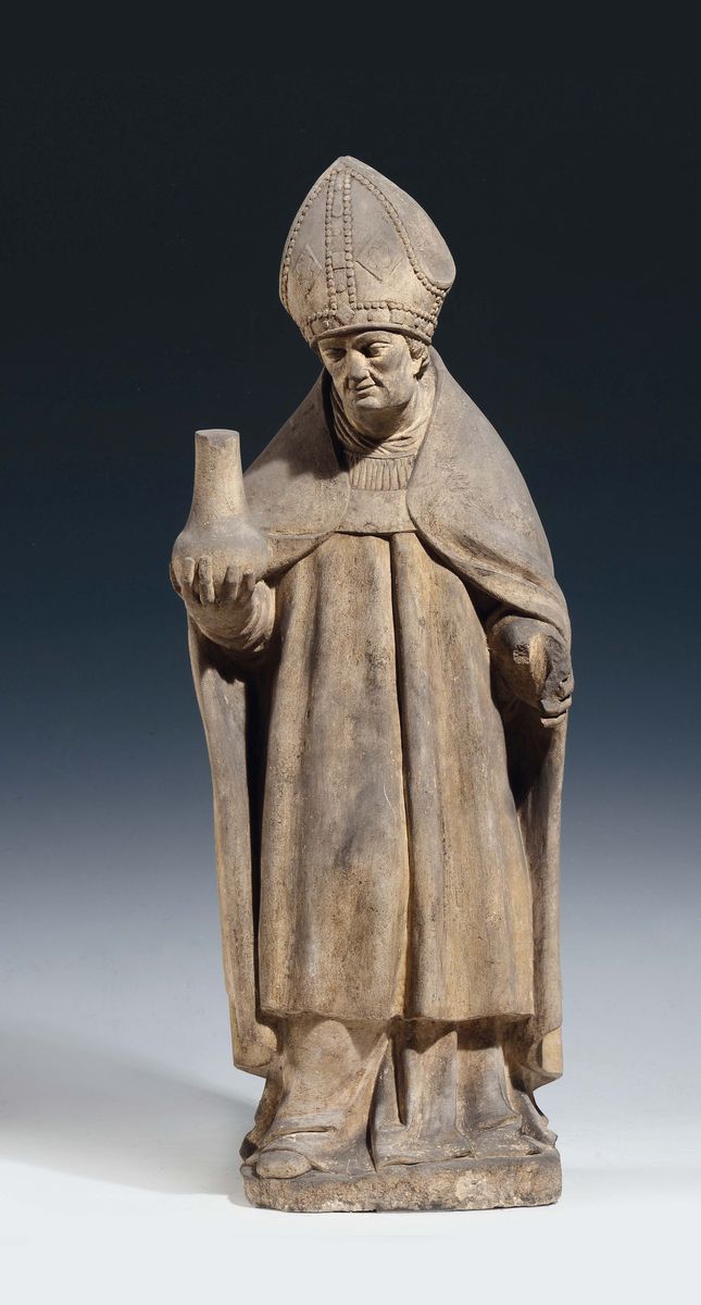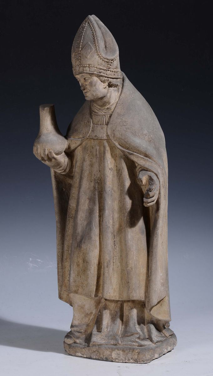 I due santi vescovi, rappresentati in piedi con i loro simboli identificativi (meno certi per la figura con il libro aperto), appartengono, probabilmente, alla produzione scultorea tra gotico e rinascimento di arca veneta, anche se alcune caratteristiche, nei volti e nell'ampia tiara, possono identificare forme stilistiche d'oltralpe in particolare affini alla Borgogna. Curioso rilevare come le due tiare siano praticamente identiche quasi a sottolineare la contiguità territoriale dei due Santi, fatto che farebbe propendere per l'ipotesi veneta essendo S.Prosdomo, rappresentato con la brocca in mano per il suo infaticabile attivismo come battezzatore, primo vescovo e patrono della città di Padova
