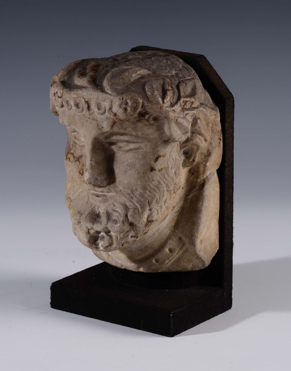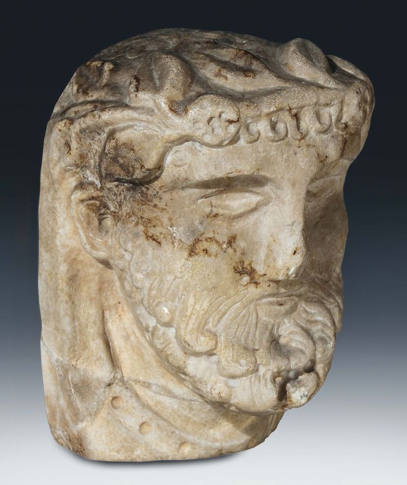 La piccola scultura, parte di una più grande composizione, raffigura una testa virile incorniciata da barba e baffi a riccioli ordinati e con il capo cinto da una corona di fiori e foglie. Tali attributi, derivati dai modelli di un classicismo antico, fanno ritenere l'opera una raffigurazione di un imperatore sviluppata nei modi della scultura gotica.