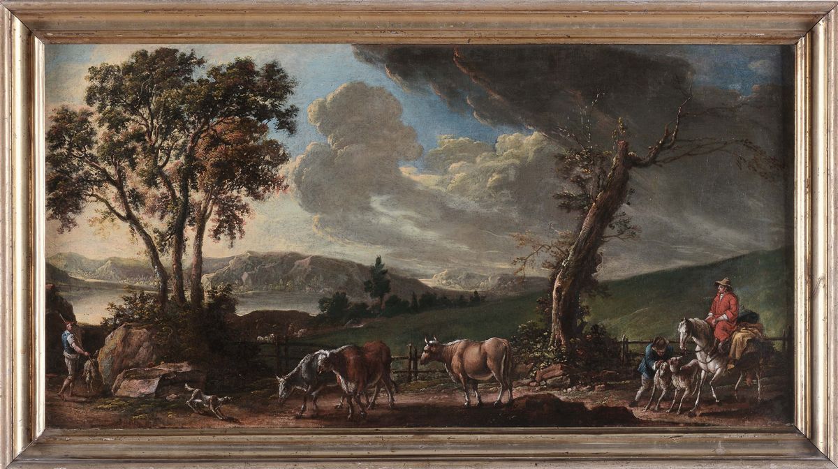 Scuola del XVIII secolo Paesaggio con figure e animali