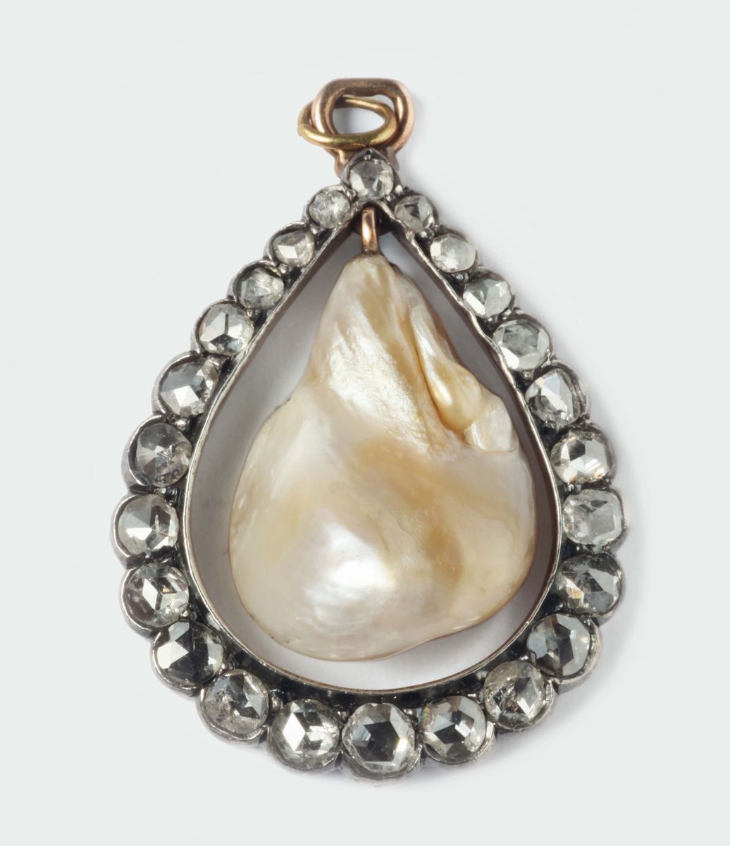 Pendente con perla naturale di acqua dolce e diamanti taglio rosa. XIX secolo, prima metà
