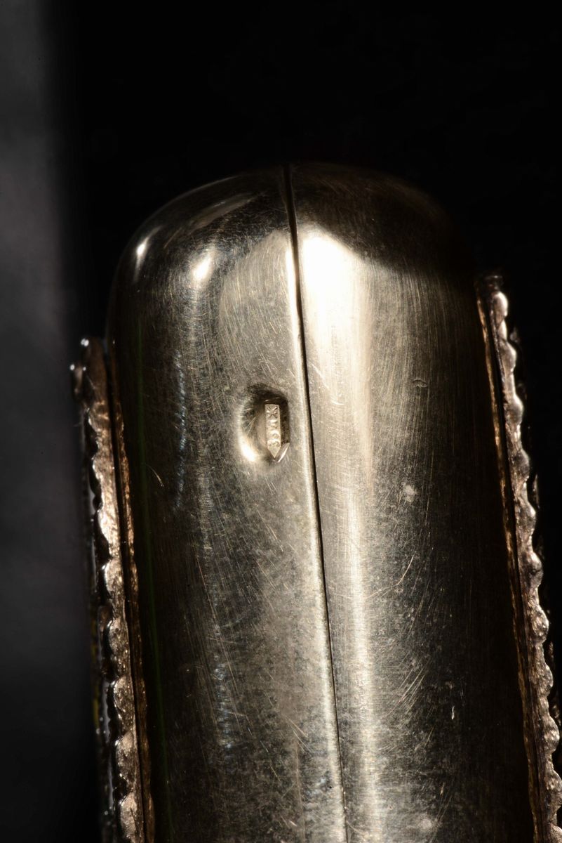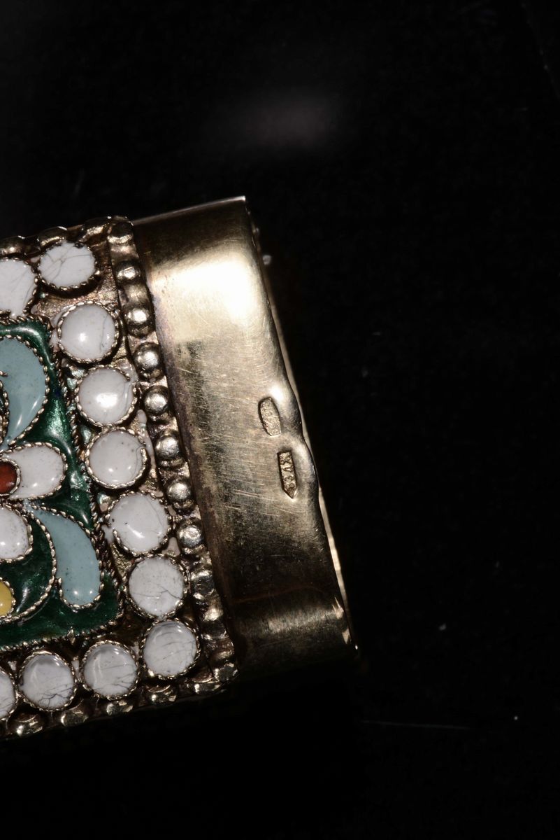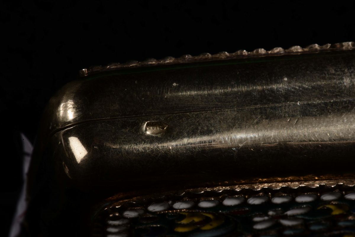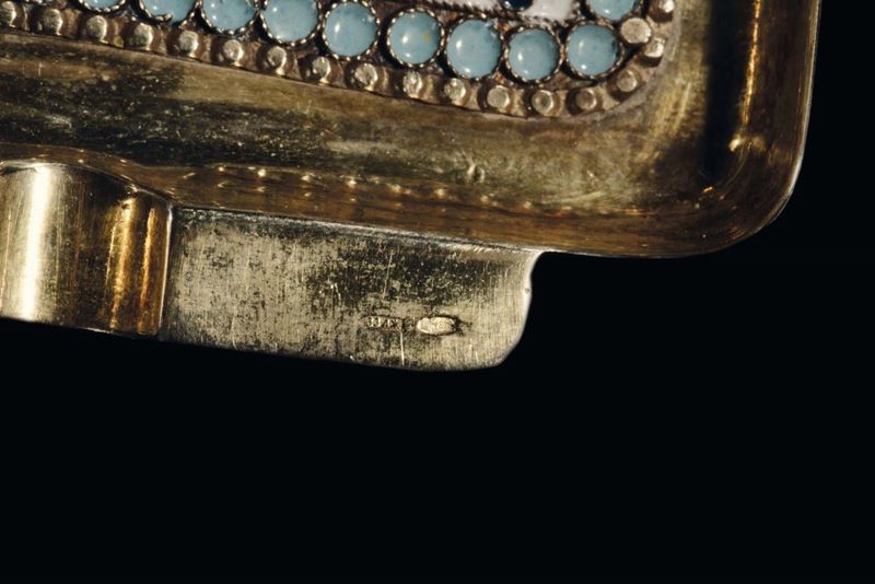 Scatola contenente portasigarette, portafiammiferi e fiaschetta in argento dorato, smalti cloisonnè. Punzoni di titolo russi della fine del XIX secolo