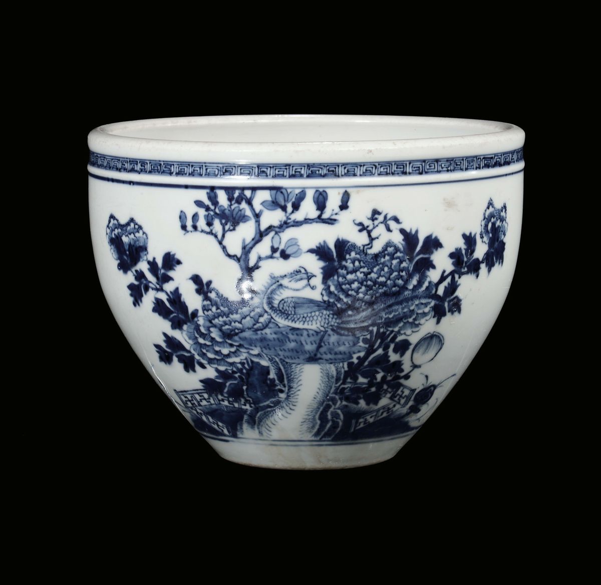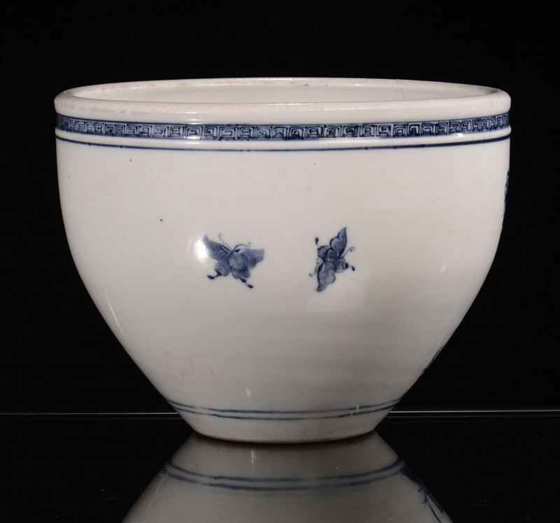 Cachepot in porcellana bianca e blu con decoro floreale, Cina, Dinastia Qing, XIX secolo